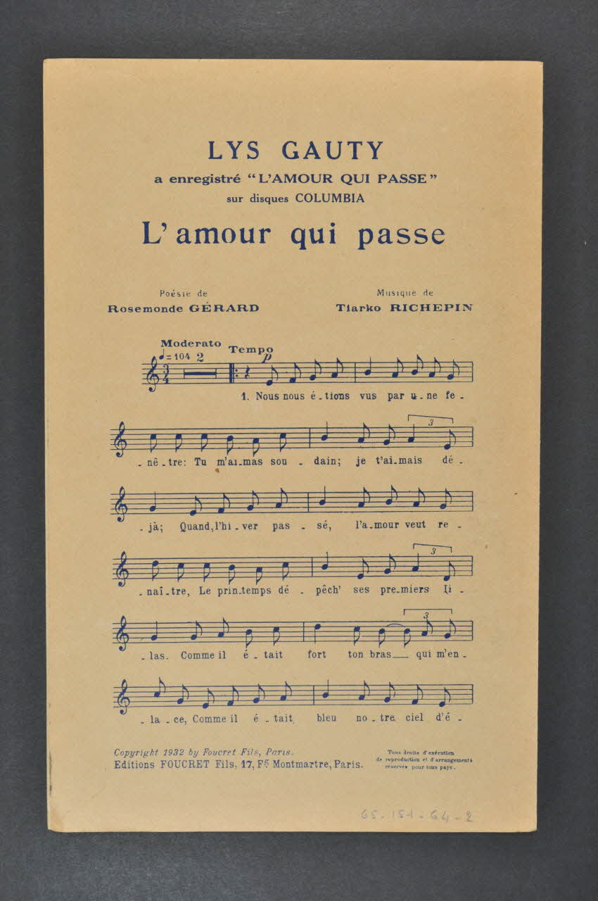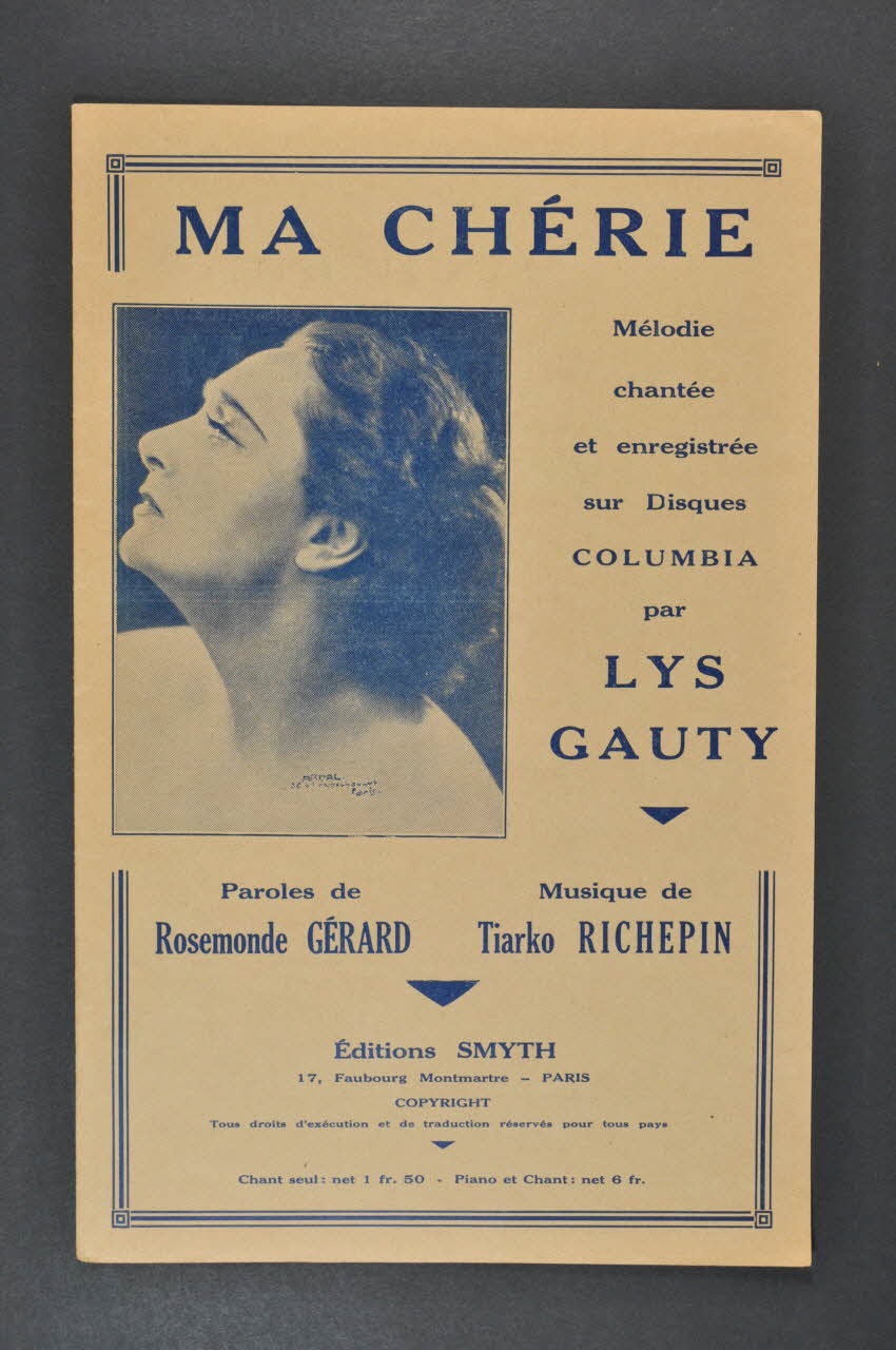 Feuillet rectangulaire en papier industriel imprimé à l'encre bleue (sauf à l'intérieur, encre noire). Sur la couverture, un portrait photographique de Lys Gauty.