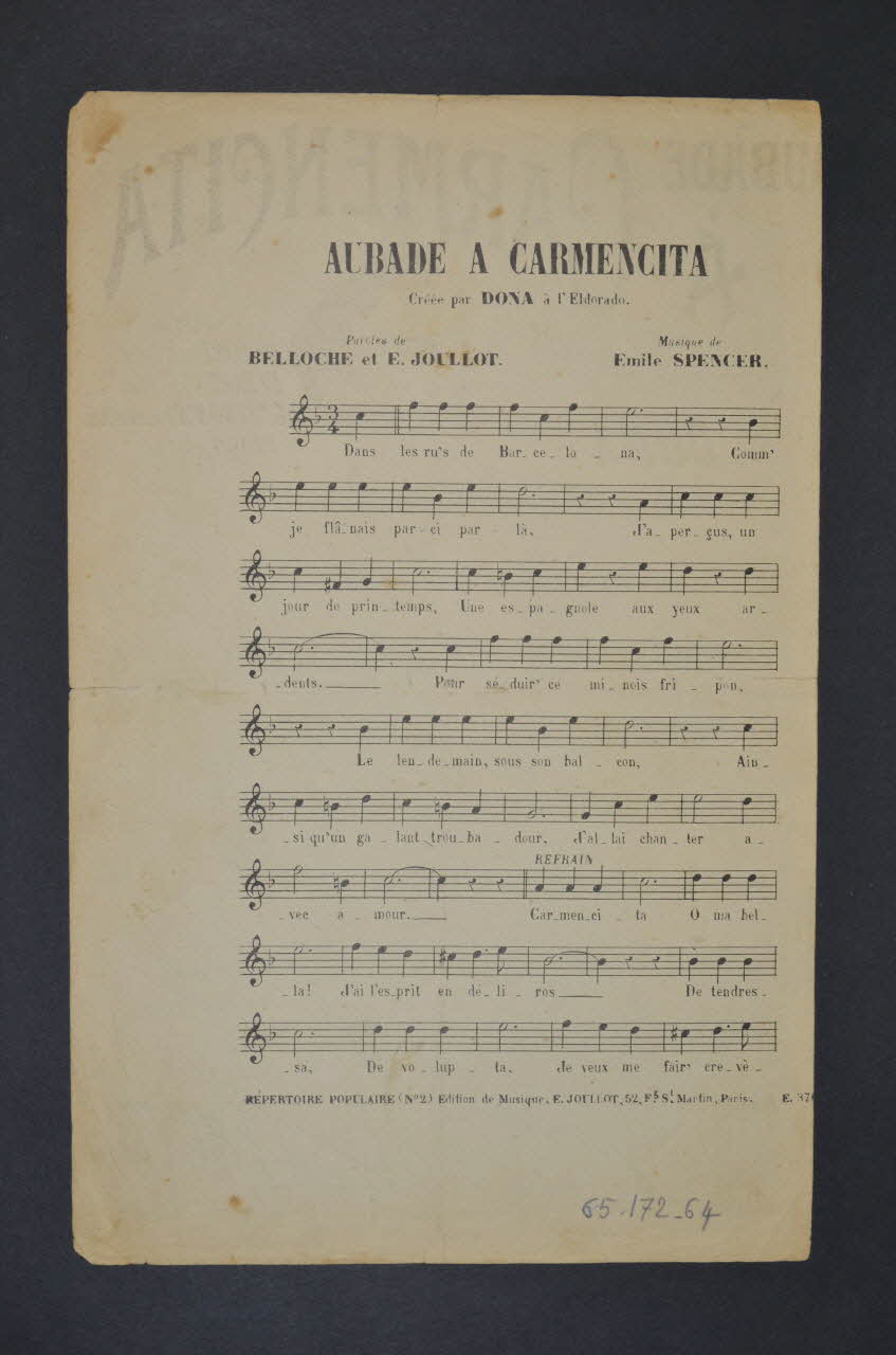 Des inscriptions renseignent le titre, les auteurs, les exécutants et l'éditeur. Au dos, partition et paroles de la chanson.Décor