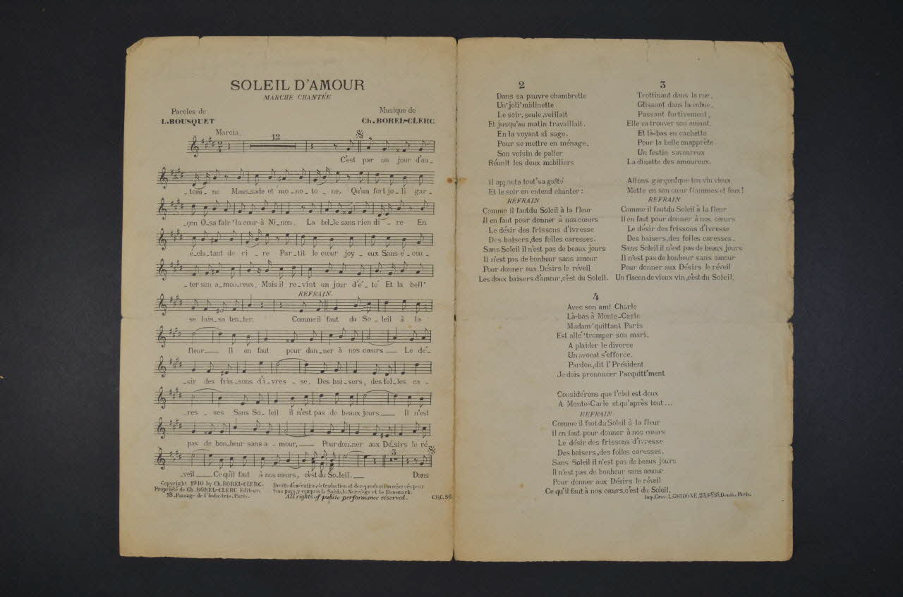 Des inscriptions renseignent le titre, les auteurs, les exécutants et l'éditeur. A l'intérieur, partition et paroles de la chanson. Au dos, liste d'autres partitions publiées par l'éditeur.Matériaux et techniques