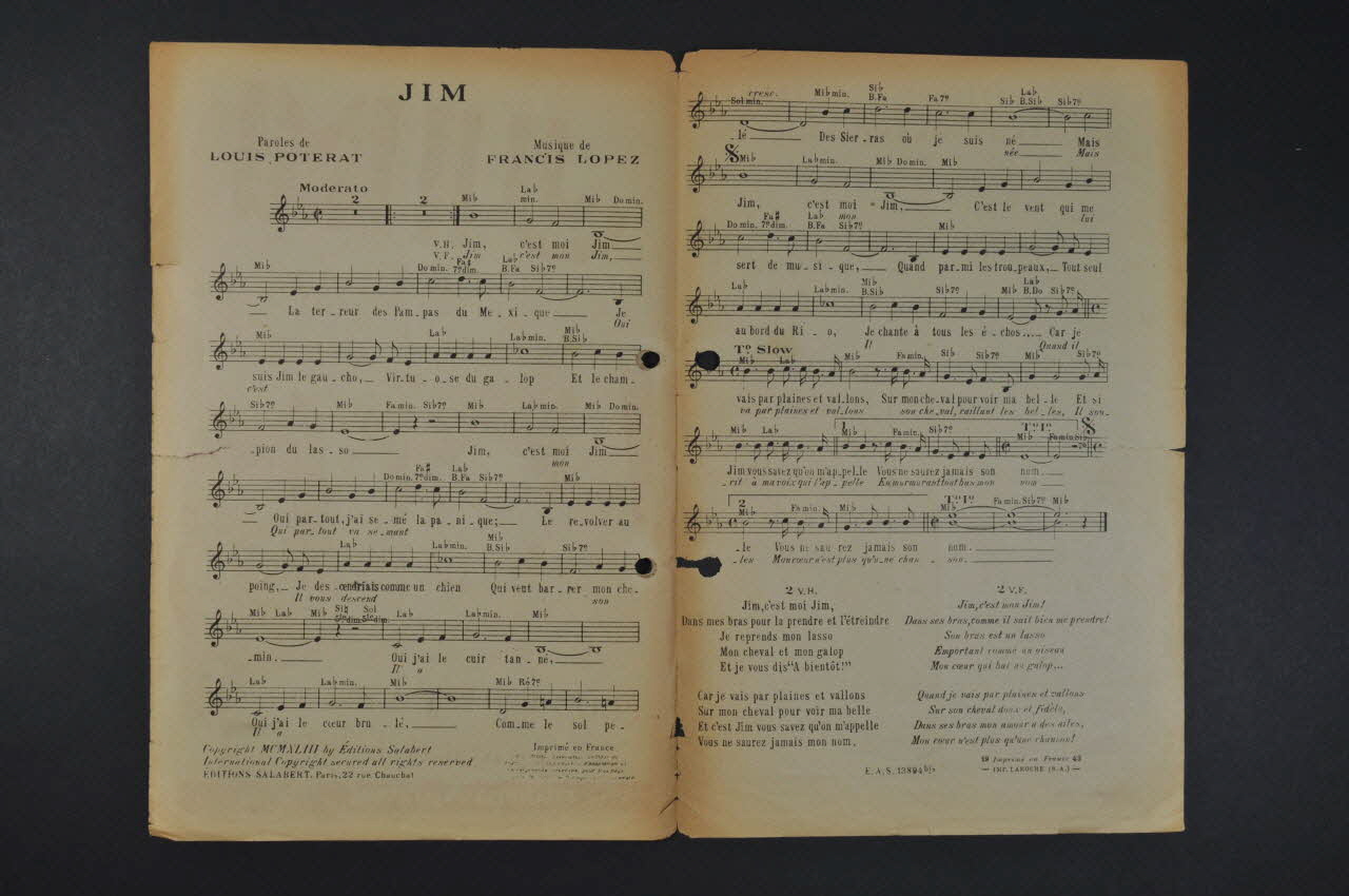 Des inscriptions renseignent le titre, les auteurs, les exécutants et l'éditeur. A l'intérieur, partition et paroles de la chanson. Au dos, liste d'autres partitions publiées par l'éditeur. Le feuillet est perforé à deux reprises au niveau de la tranche.Matériaux et techniques