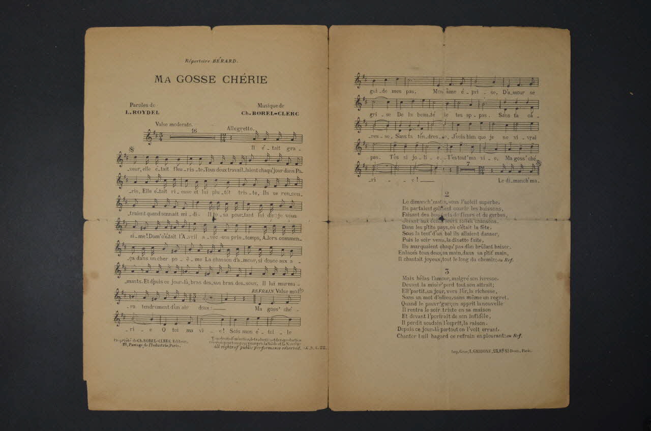 Les inscriptions renseignent le titre de la chanson, le nom des auteurs, de l'artiste et de l'éditeur. A l'intérieur, partition et paroles de la chanson. Le revers est laissé vierge.Matériaux et techniques