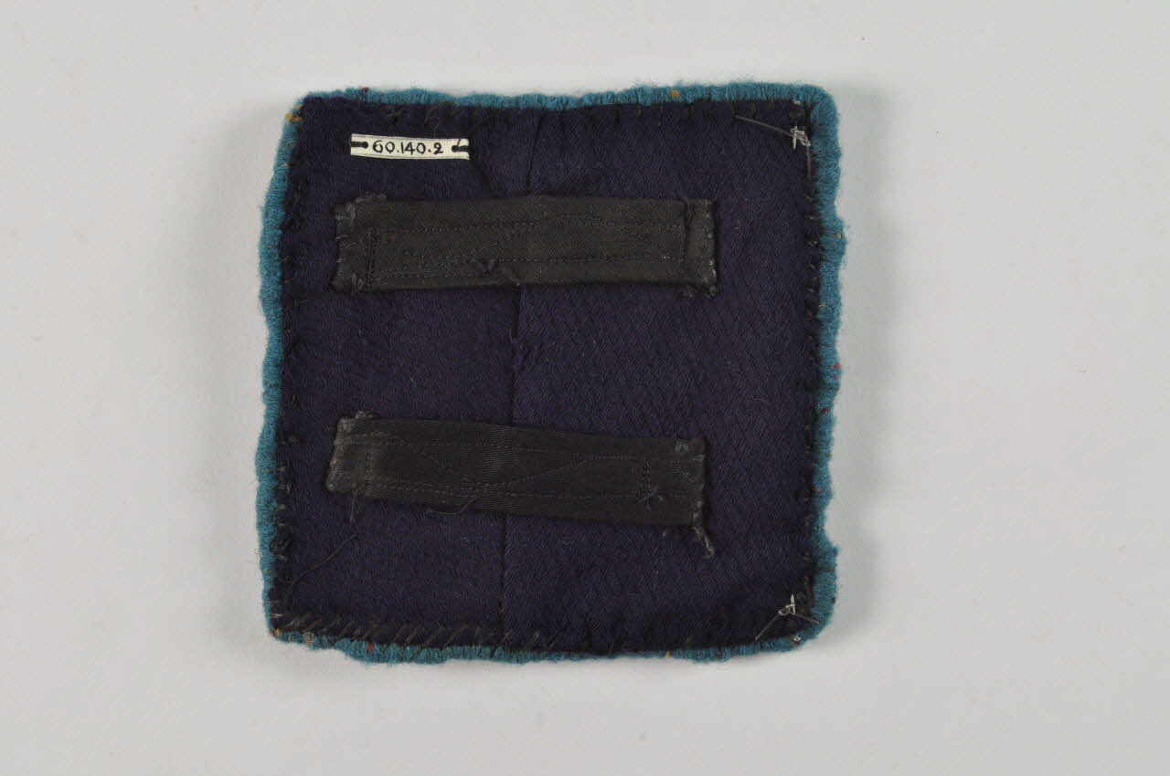 "Salièra", de forme carrée, en laine tricotée bleue, rouge et marron, avec une fente horizontale. En drap de laine bleu à l'arrière avec deux passants en toile de coton noire. Intérieur en toile de coton bleue à rayures blanches entrecroisées et en toile de jute crème.Matériaux et techniques