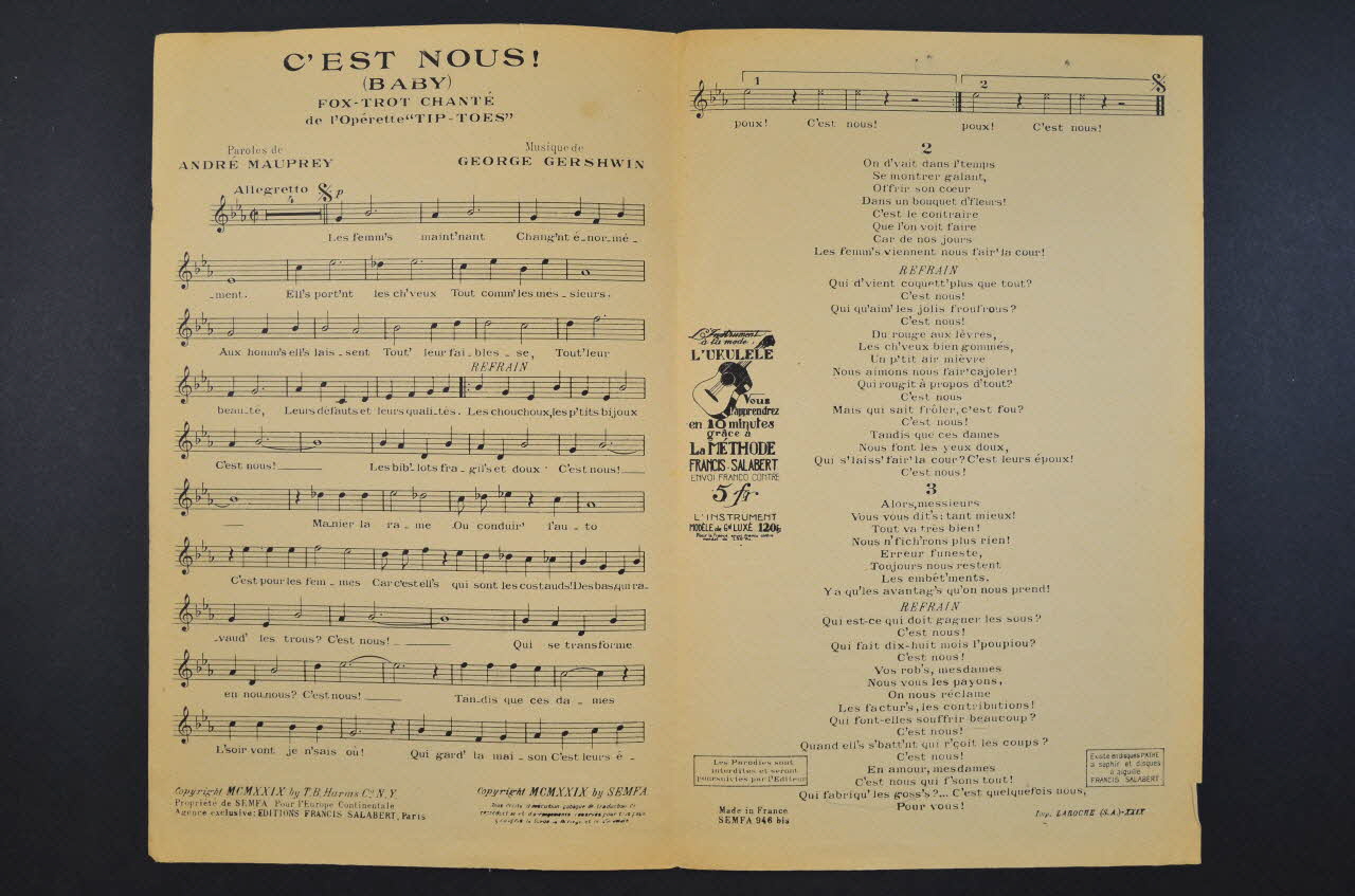 Les inscriptions renseignent le titre de la chanson, le nom des auteurs, de l'artiste et de l'éditeur. A l'intérieur, partitions et paroles de la chanson. Au dos, liste d?autres partitions publiées par l?éditeur.Décor
