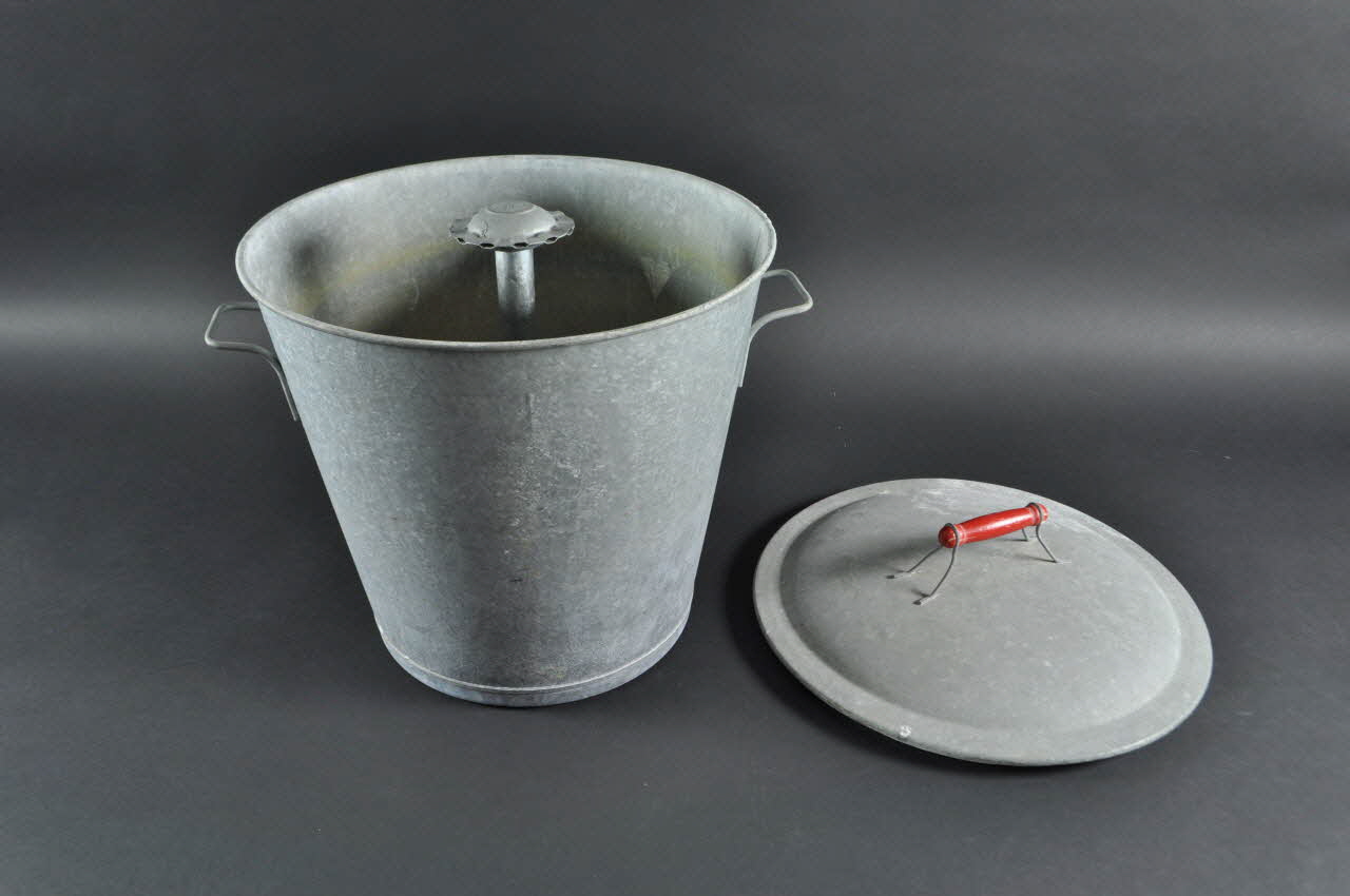 Le couvercle est pourvu, en son centre, d'une petite poignée en bois tourné, peinte en rouge, maintenue par deux crochets métalliques, soudés au métal.Matériaux et techniques