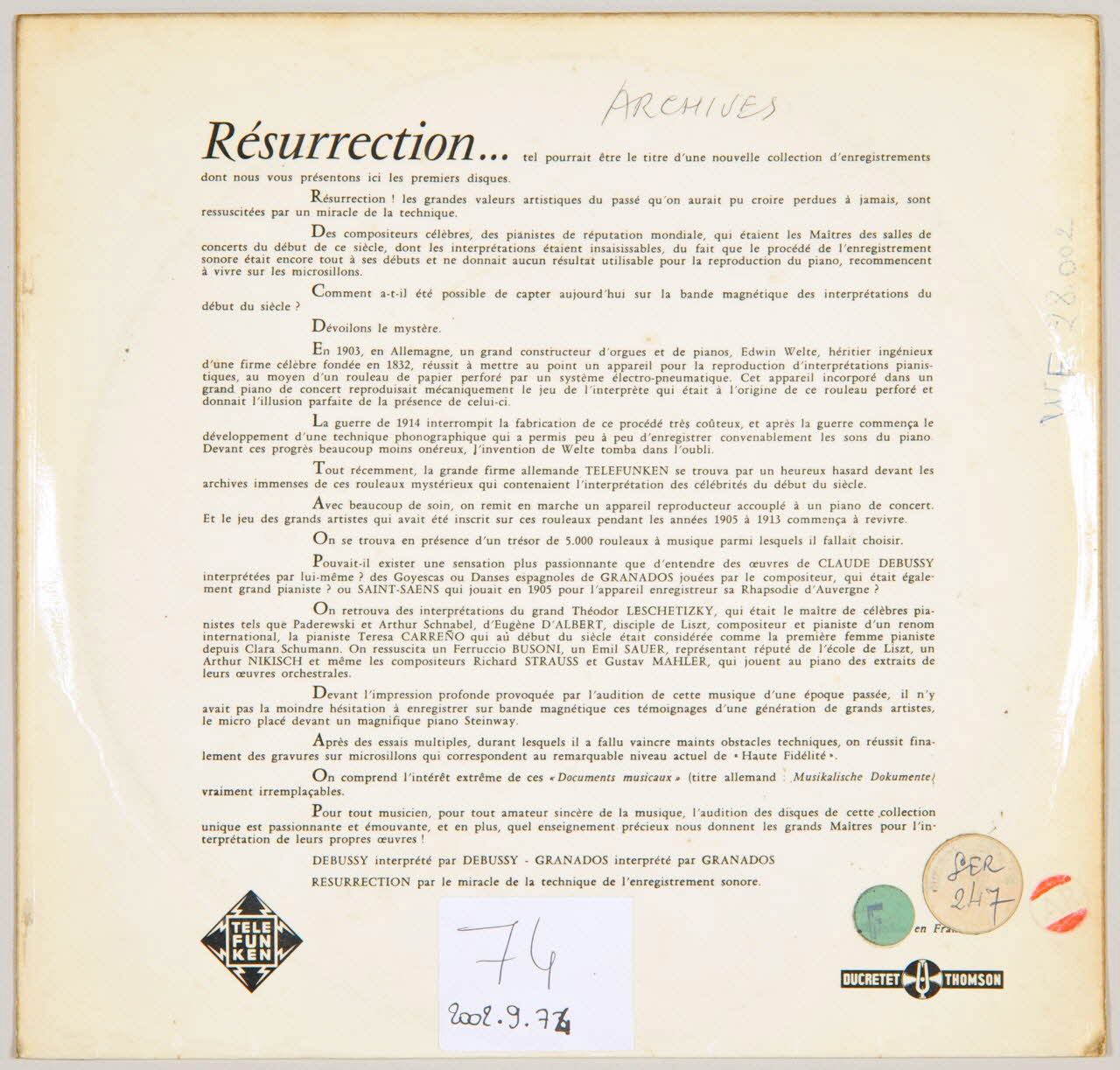 Au verso de la pochette, un texte explicatif sur la thématique du disque. Un timbre publicitaire est collé sur les deux faces du disque.Matériaux et techniques