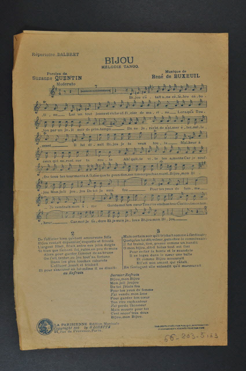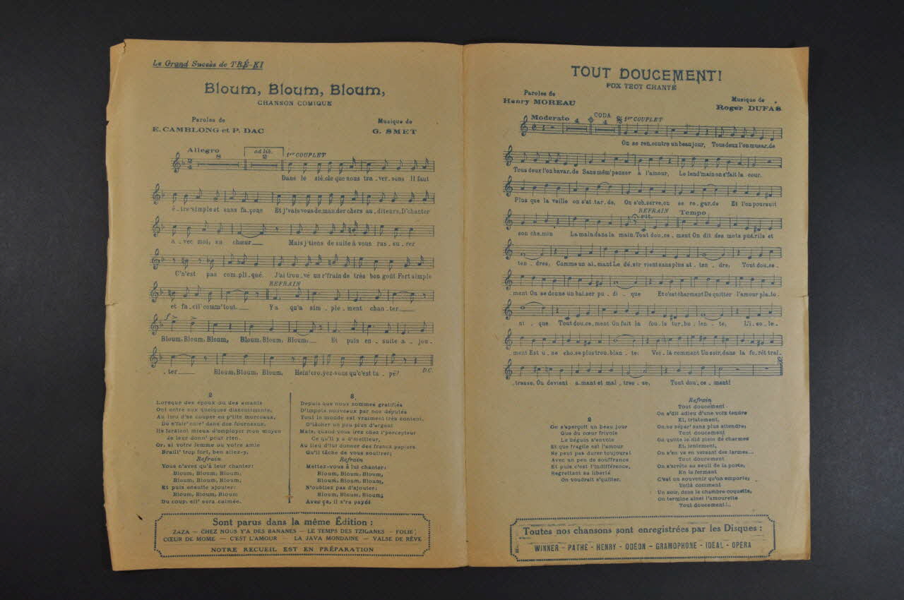 Les inscriptions renseignent les titres de la chanson, le nom des auteurs, de l'artiste et de l'éditeur. A l'intérieur et au dos, partitions et paroles de la chanson.Décor
