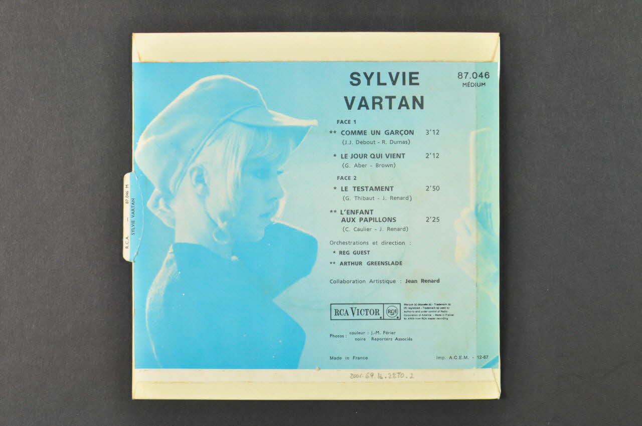 Le disque rond et noir comporte une perforation circulaire au centre. Une étiquette bleue contenant le nom du chanteur, le titre des chansons, le logo de l'éditeur ainsi que d'autres inscriptions en noir est collée au centre.