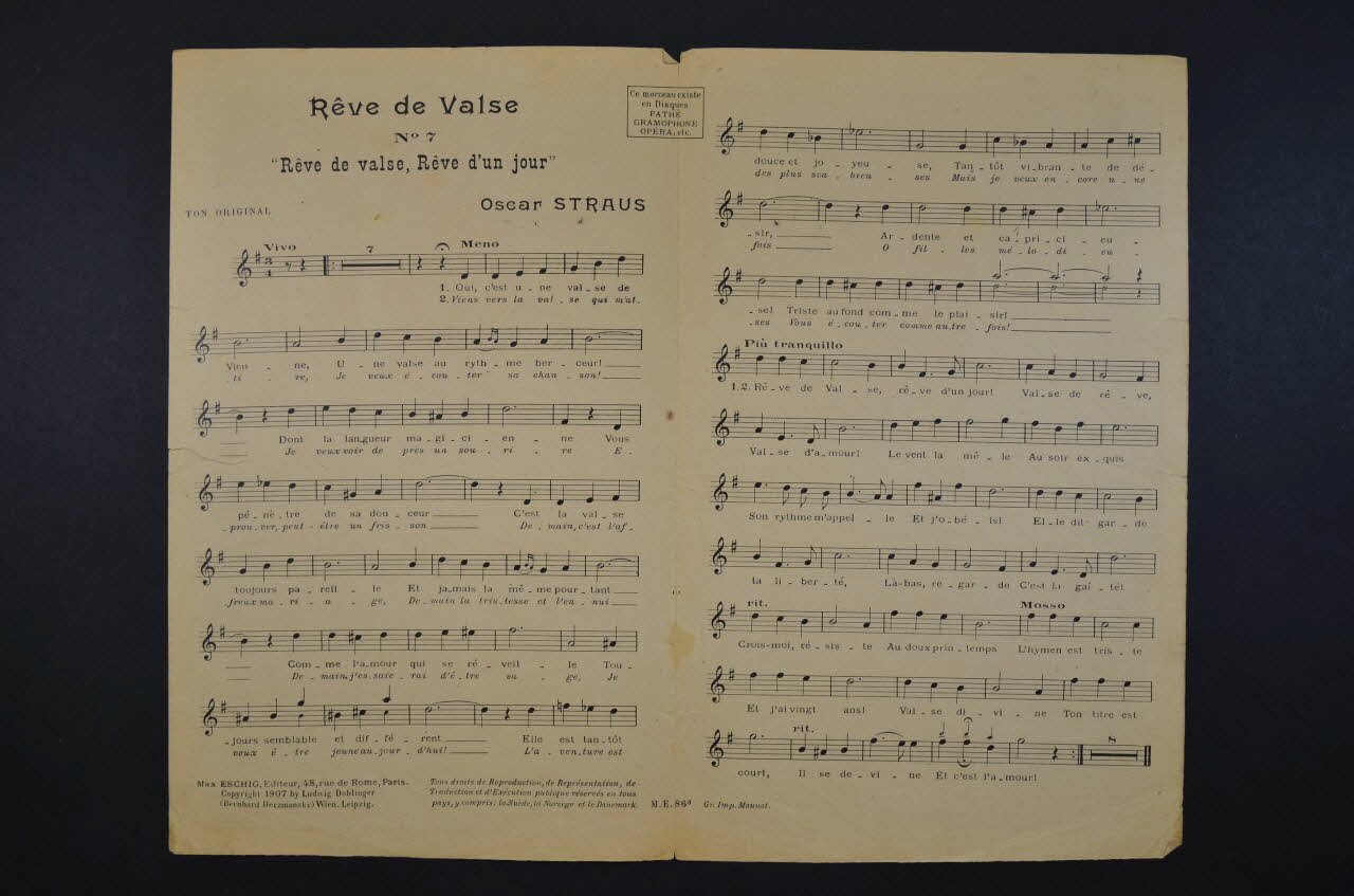 Les inscriptions renseignent le titre de la chanson, le nom des auteurs, de l'artiste et de l'éditeur. A l'intérieur, partitions et paroles de la chanson. Au dos, liste d?autres partitions publiées par l?éditeur.Décor