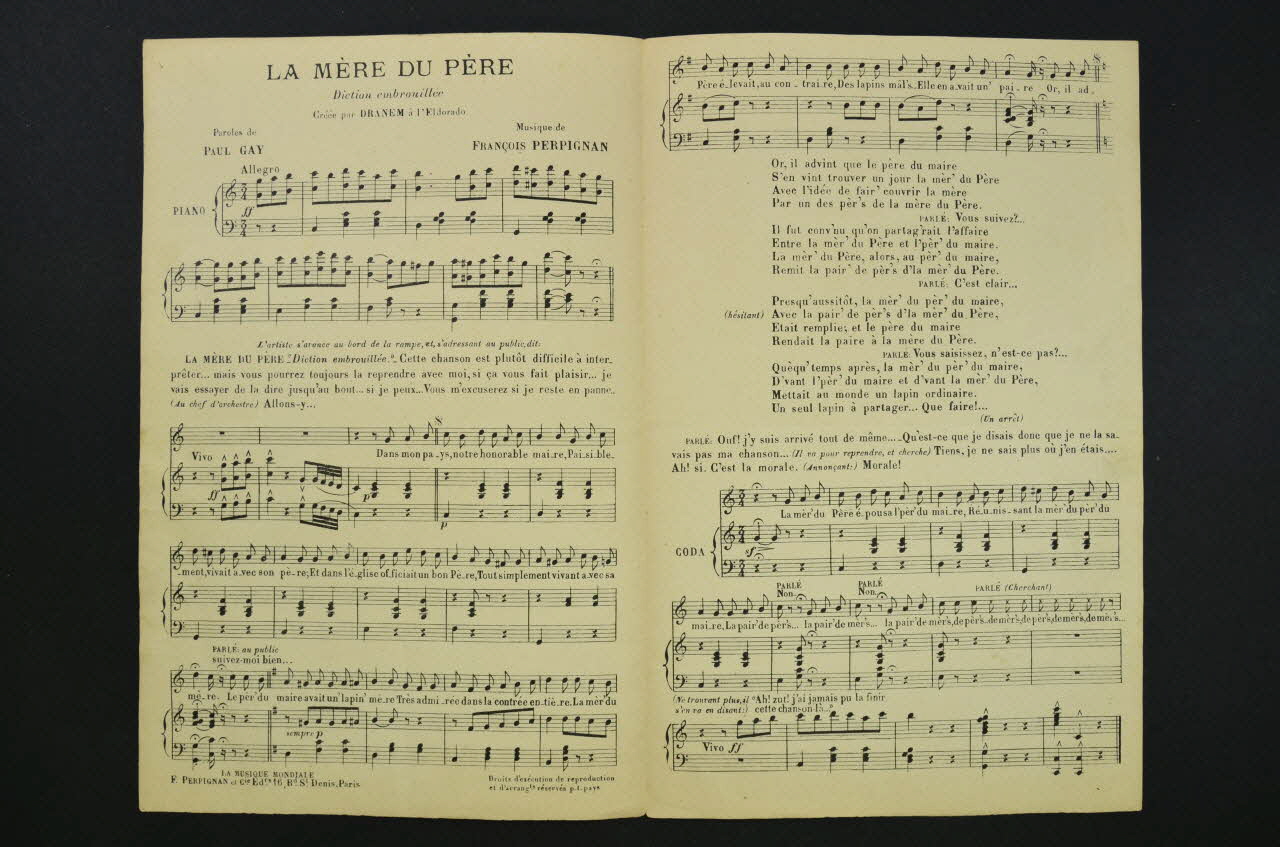La couverture du feuillet présente le portrait photographique du chanteur Dranem, figuré en buste. Les inscriptions renseignent le titre de la chanson, le nom des auteurs, de l'artiste et de l'éditeur ainsi que les tarfis des partitions. A l'intérieur, partition et paroles de la chanson. Le dos est laissé vierge.Décor