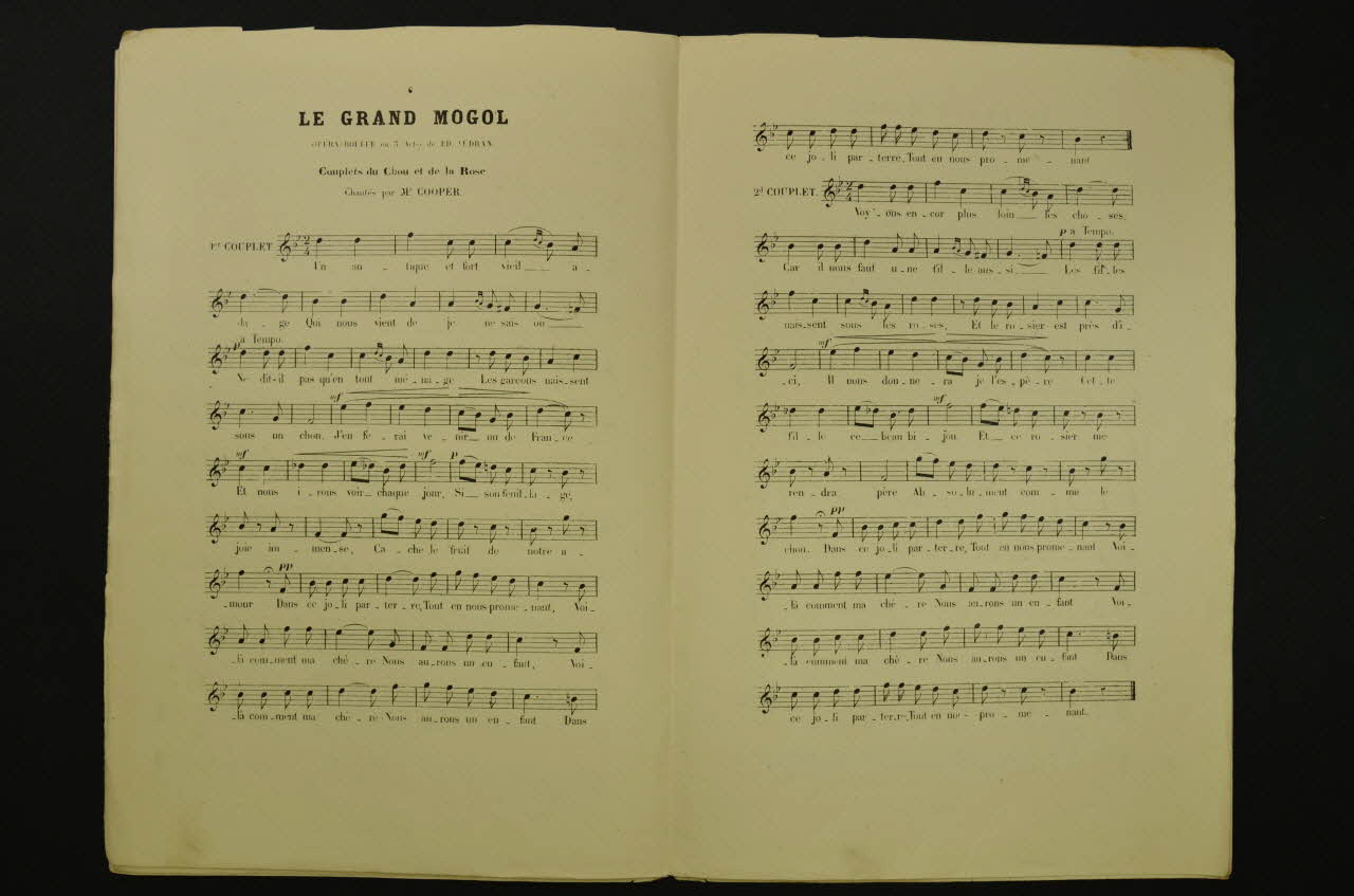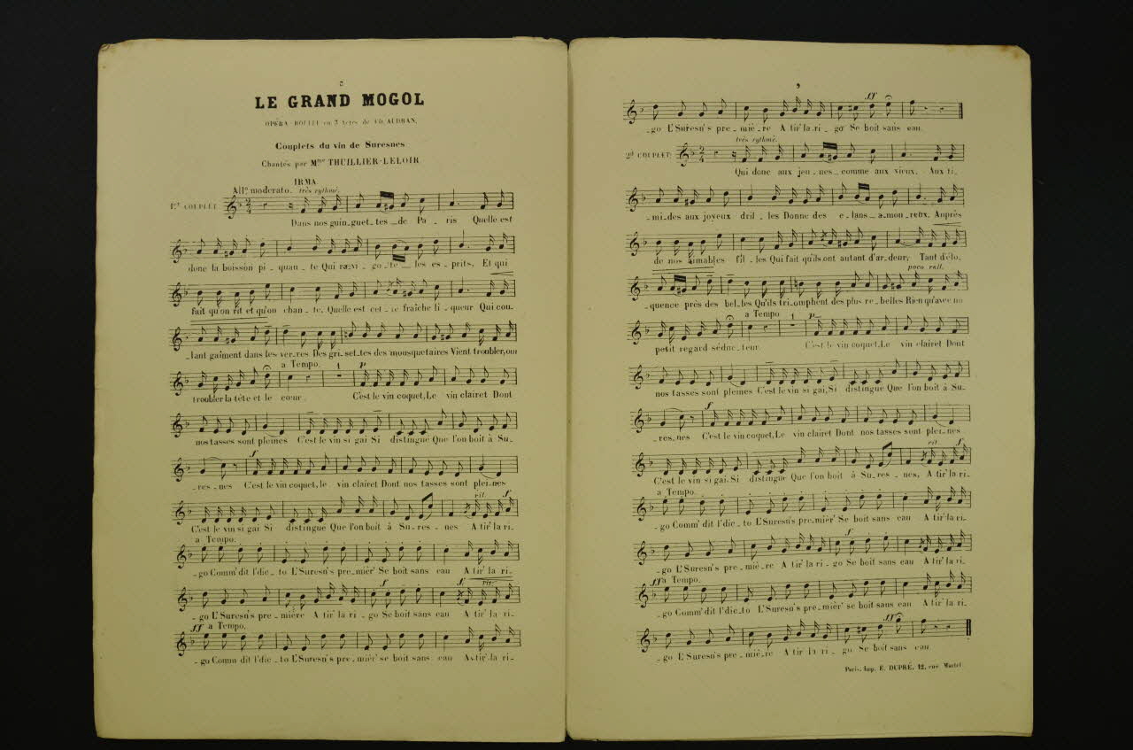 partition de musique, chanson, livret, Couplets du vin de Suresnes, Duetto, Le grand Mogol, Couplets du chou et de la rose, Kiri kiribi