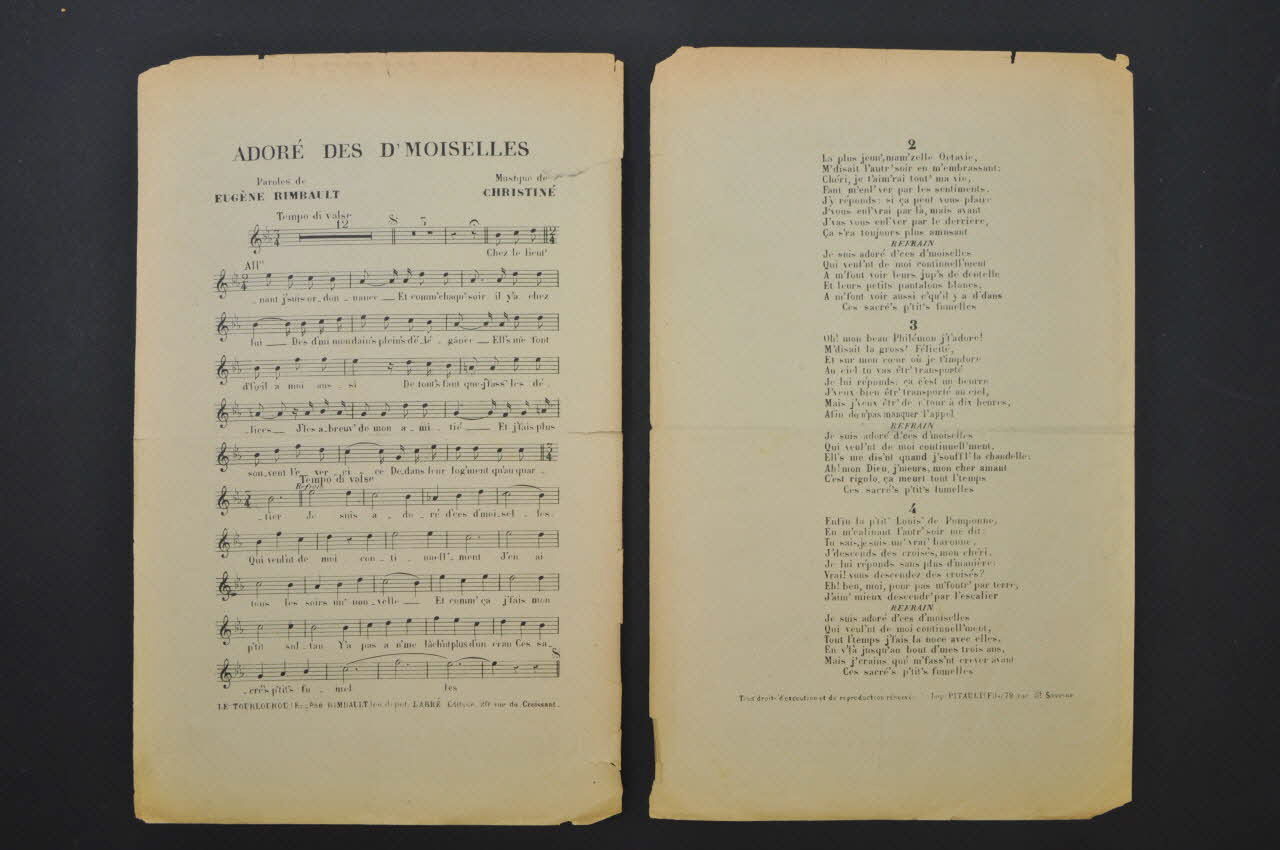 Feuillet rectangulaire en papier industriel, imprimé à l?encre noire. Partition en mauvais état de conservation : les deux volets du feuillets sont désolidarisés suite à la déchirure de la tranche sur toute sa hauteur.