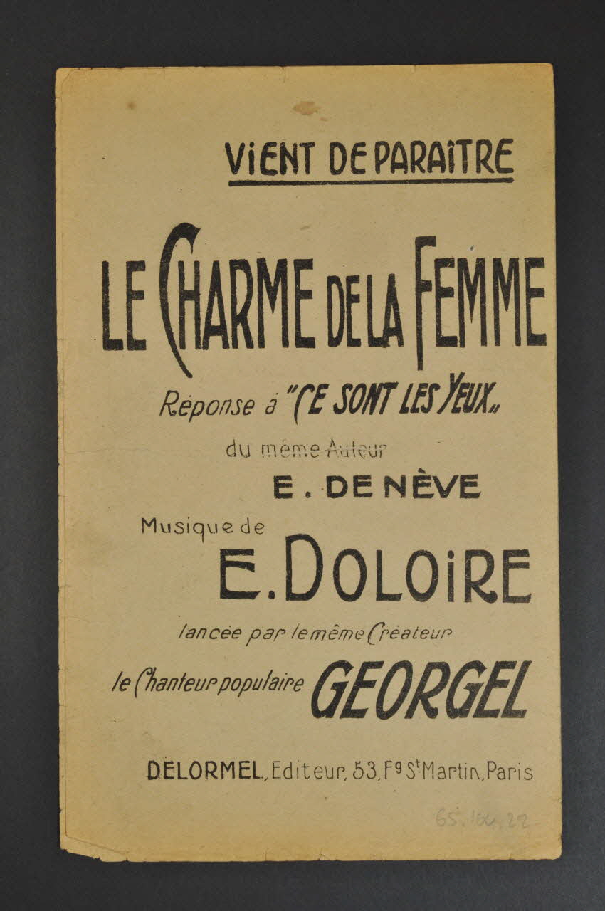 Des inscriptions renseignent le titre, les auteurs, les exécutants et l'éditeur. A l'intérieur, partition et paroles de la chanson. Au dos, publicité pour la chanson "Le charme de la femme", qui vient de paraître.Décor