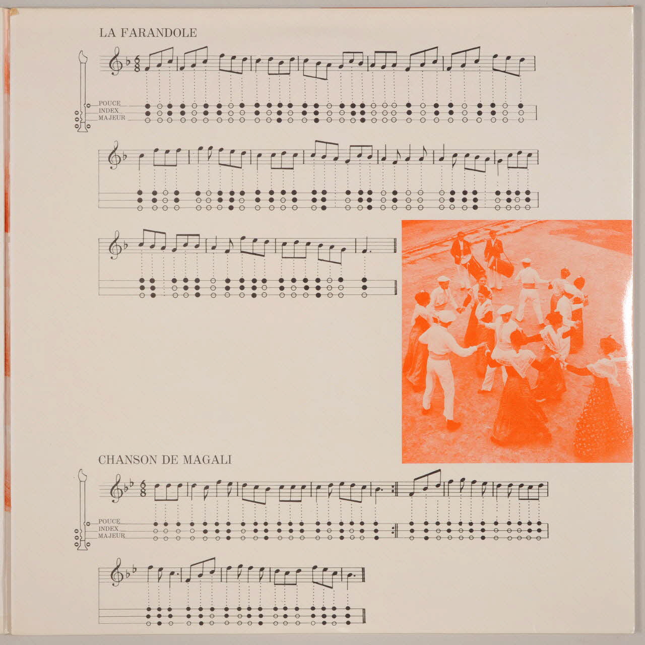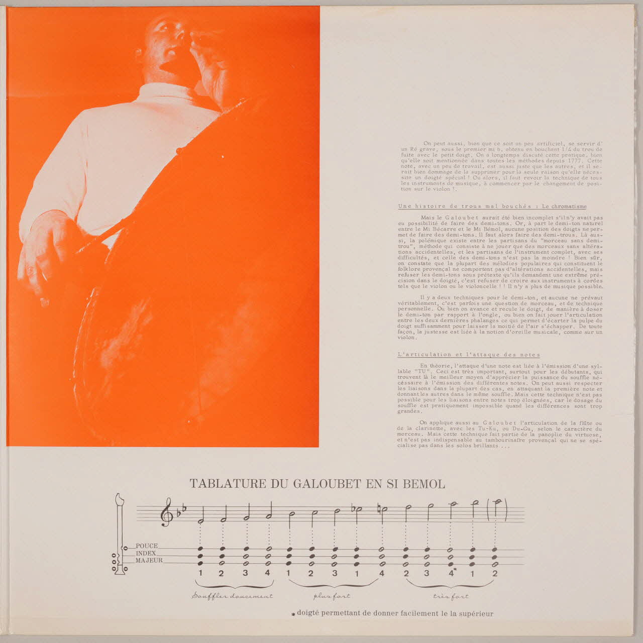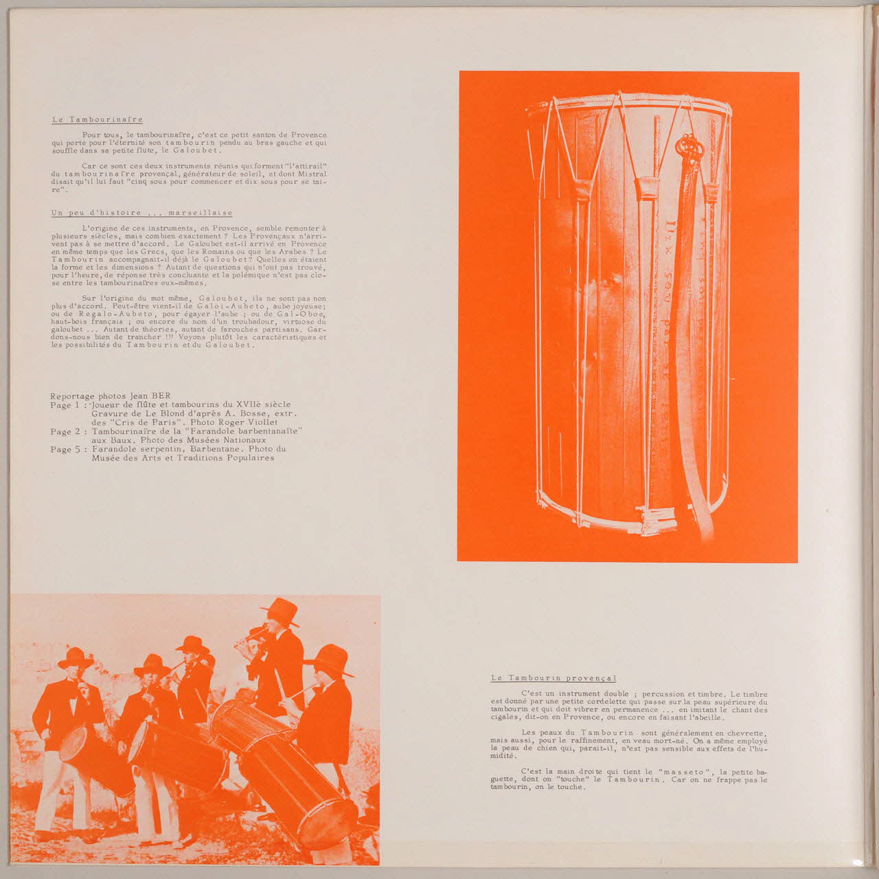 Au verso de la pochette, une photographie noir et blanc d'un tambourinaïre. Des inscriptions sur les deux faces de la pochette et sur l'étiquette rouge du disque renseignent les titres et les exécutants de l'album. A l'intérieur de la pochette et sur les rabats, un texte explicatif sur la thématique de l'album, des portées de musique et des photographies illustrant l'ensemble.Matériaux et techniques