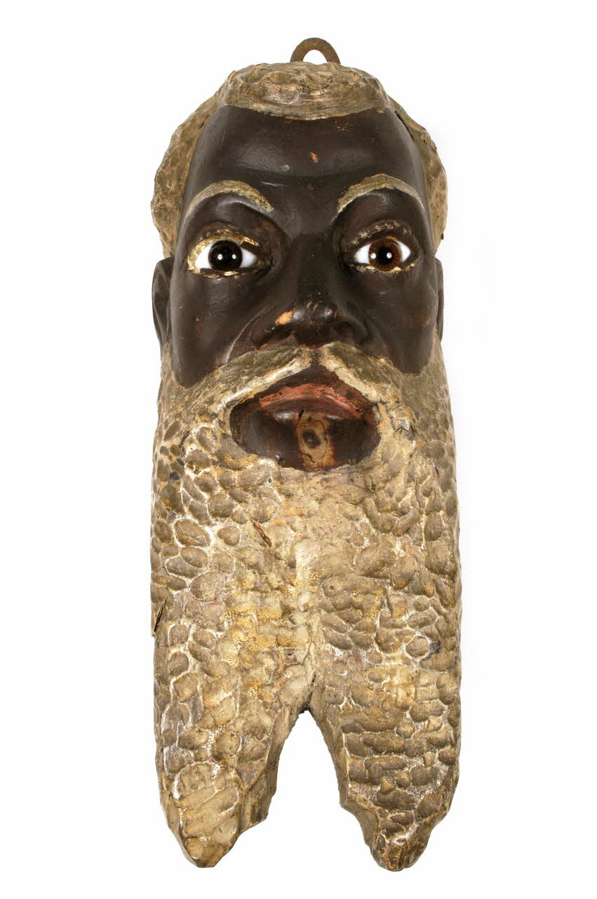 Bois de tilleul sculpté et peint, yeux de verre incrusté, métal / La tête de marionnette représente un homme noir, aux cheveux blancs courts et crépus portant une moustache et une longue barbe blanche à double pointe. Deux anneaux métalliques sont placés au sommet de la tête et sous le cou. La manipulation de la marionnette se fait par le haut ( marionnette à tige ?)Décor
