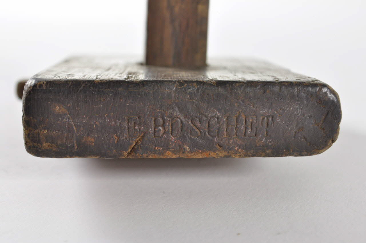 Longue tige en bois, de section carrée, percée d'un trou en son extrémité. Elle s'insère dans une plaque rectangulaire dans laquelle est également incluse une fine tige plate. Un clou en fer permet de bloquer la tige carrée.Matériaux et techniques