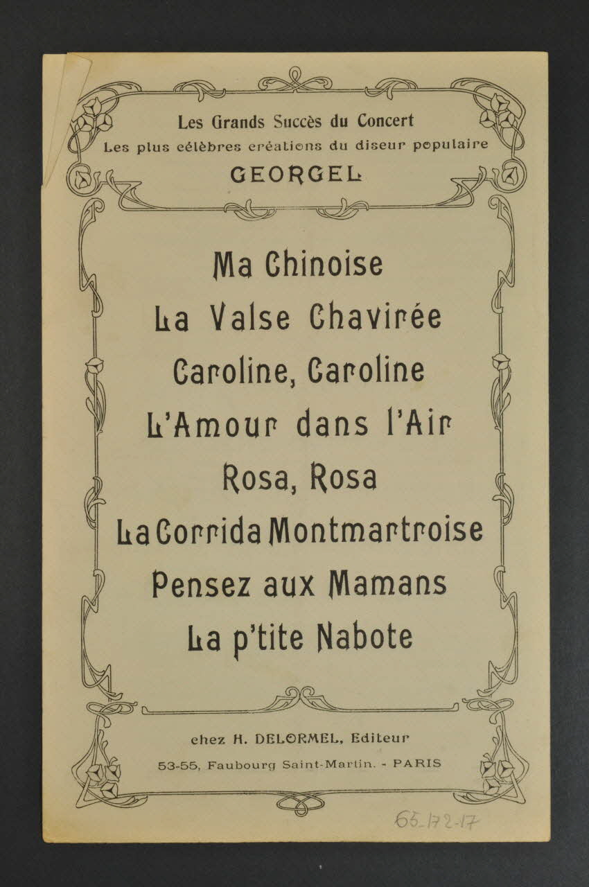 Les inscriptions renseignent le titre de la chanson, le nom des auteurs, de l'artiste et de l'éditeur. A l'intérieur, partitions et paroles de la chanson. Au dos, liste d?autres partitions publiées par l?éditeur.Décor