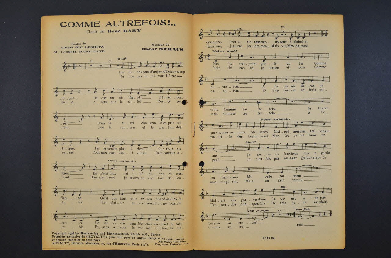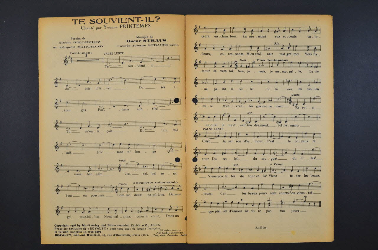 Des inscriptions renseignent le titre, les auteurs, les exécutants et l'éditeur. A l'intérieur, partition et paroles de la chanson. Au dos, liste d'autres partitions publiées par l'éditeur. Deux perforations près de la tranche.Matériaux et techniques