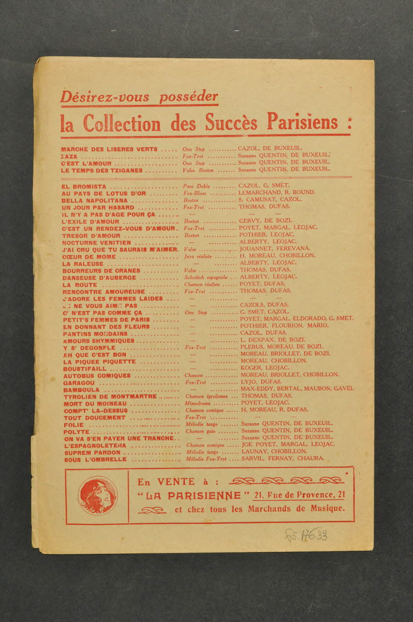 Des inscriptions renseignent le titre, les auteurs, les exécutants et l'éditeur. A l'intérieur, partition et paroles de la chanson. Au dos, liste d'autres partitions publiées par l'éditeur.Décor