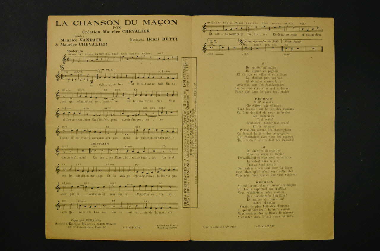 Feuillet rectangulaire en papier industriel, imprimé à l?encre rouge (sauf l?intérieur à l?encre noire). La couverture du feuillet présente la photographie de Maurice Chevalier.