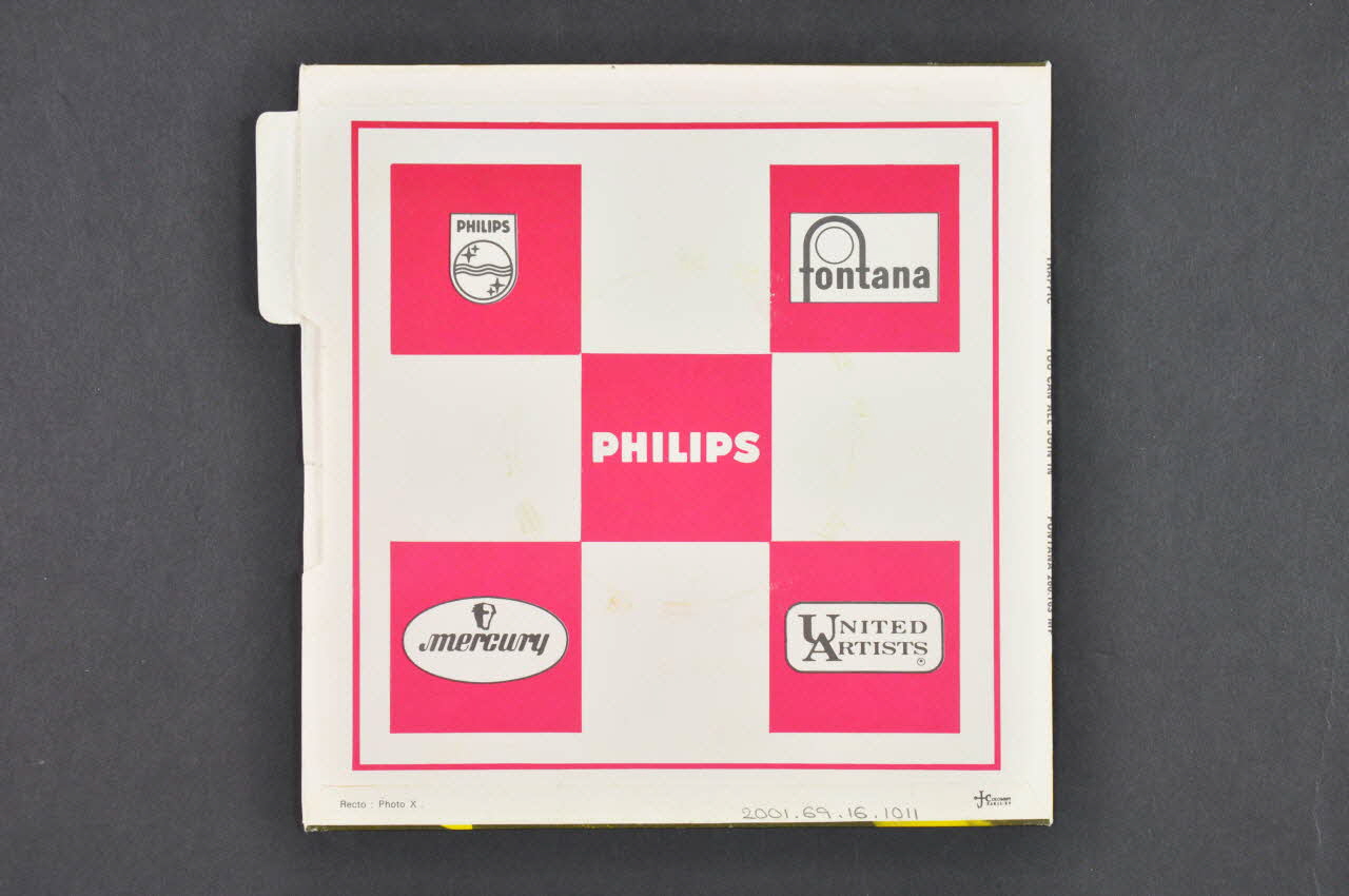 Au recto figurent le nom du groupe et le titre des chansons ainsi qu'une photographie dans des tons jaunes des visages des trois membres du groupe. Le logo de l'éditeur est présent dans le coin inférieur gauche. Un onglet blanc contenant des inscriptions noires se trouve dans le coin supérieur droit. Le verso comporte des logos de maisons d'édition dans des carrés roses sur fond blanc.Matériaux et techniques