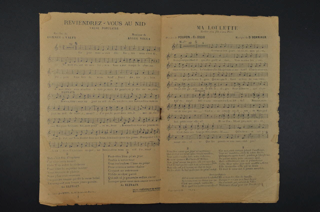chanson, petit format, partition de musique, Reviendrez vous au nid, On m'a donné tout ça, Chanson dans la rue, Ma loulette, Le tourbillon du soir, C'est une chanson dans la nuit, Aimez celle que j'aime