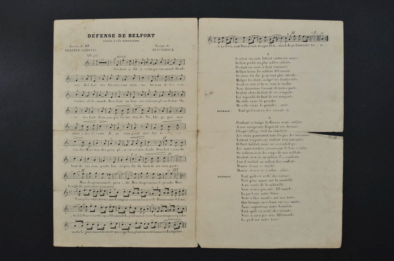 Feuillet rectangulaire en papier industriel, imprimé à l?encre noire. La couverture du feuillet présente le dessin d'un militaire brandissant son épée, une femme près de lui.