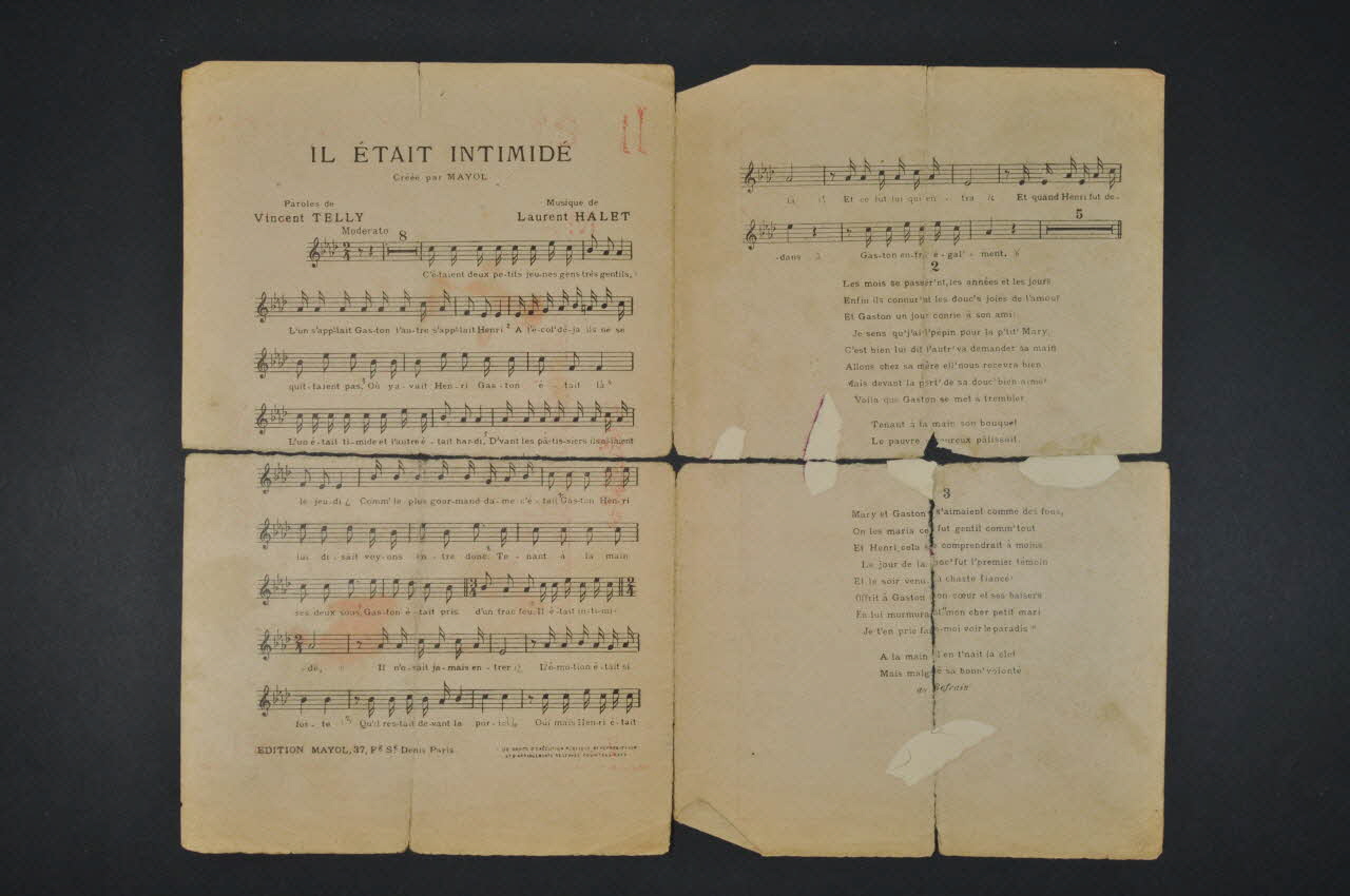 Feuillet rectangulaire en papier industriel, imprimé à l?encre roue sur la couverture et le dos, à l'encre noire à l'intérieur. Partition en mauvais état de conservation, conservée en deux morceaux suite à la déchirure de la pliure horizontale médiane ; nombreux dépôts de papier blanc encollé dus à une réparation antérieure.
