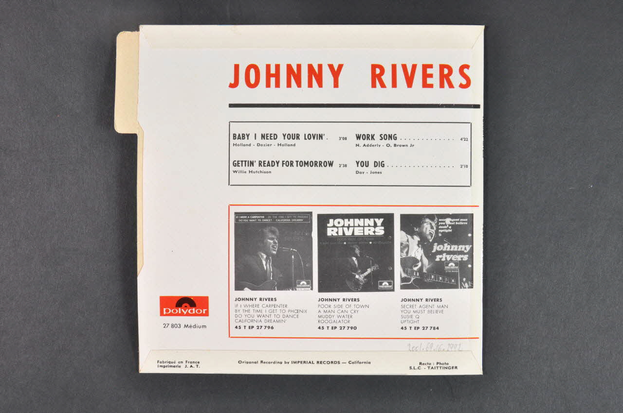 Pochette de disque de forme carrée, en carton plié et collé. Le recto présente du texte (nom du groupe, titres des morceaux...) ainsi que la photographie en couleur de l'artiste (au centre). Une languette dans la partie supérieure du bord gauche indique le nom du chanteur. Le verso présente à la fois le nom de l'artiste, les titres et les auteurs des morceaux ainsi que leur durée respective. Par ailleurs, on y trouve la référence à d'autres succès de l'artiste.Matériaux et techniques