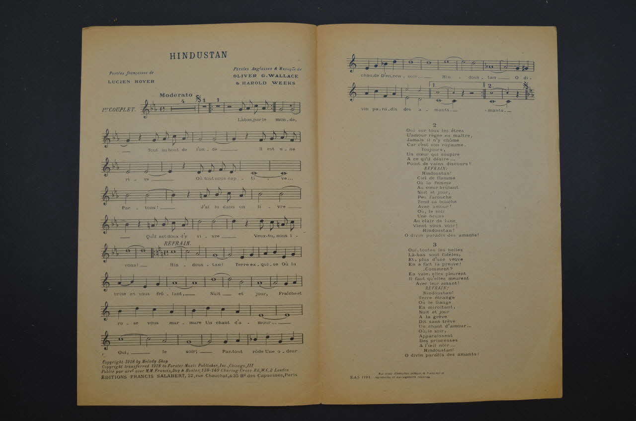 Des inscriptions renseignent le titre, les auteurs, les exécutants et l'éditeur. A l'intérieur, partition et paroles de la chanson. Au dos, liste d'autres partitions publiées par l'éditeur.Décor