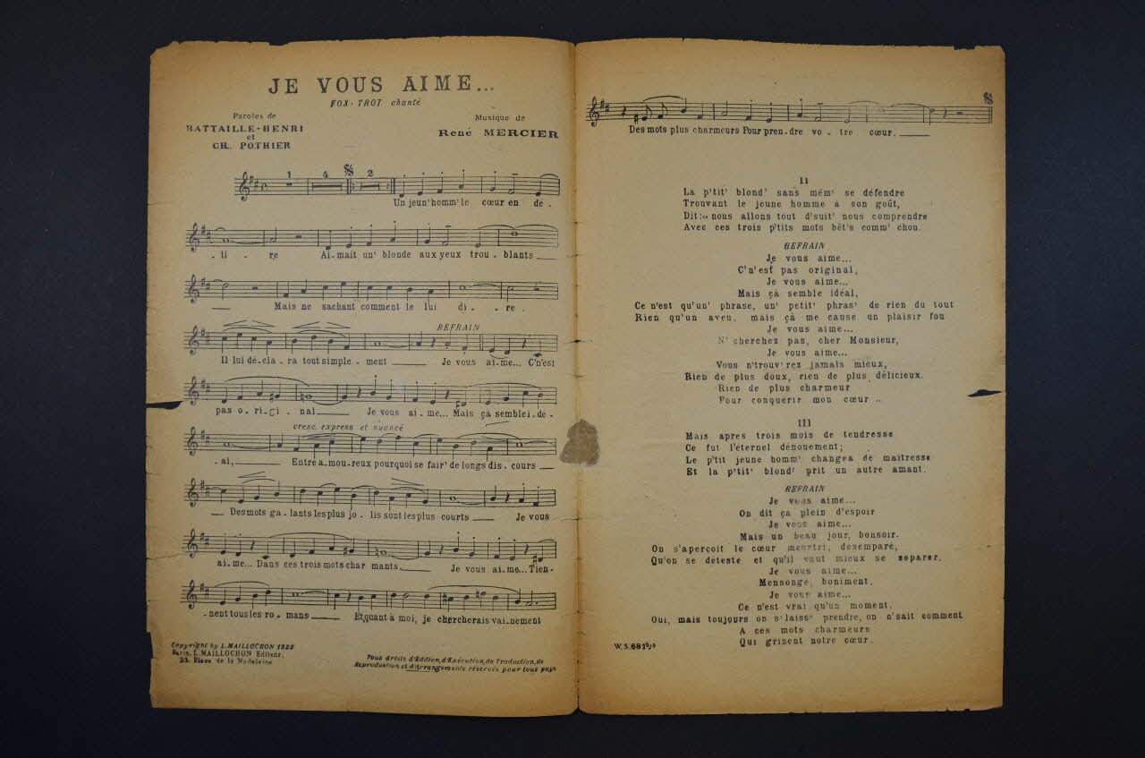 Des inscriptions renseignent le titre, les auteurs, les exécutants et l'éditeur. A l'intérieur, partition et paroles de la chanson. Un papier pour renforcer la tranche a été placé. Au dos, liste d'autres partitions publiées par l'éditeur.Décor