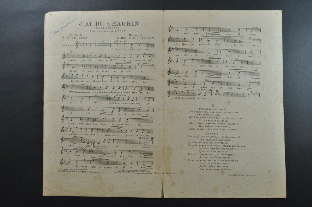 Des inscriptions renseignent le titre, les auteurs, les exécutants et l'éditeur. A l'intérieur, partition et paroles de la chanson. Le dos est laissé vierge.Décor