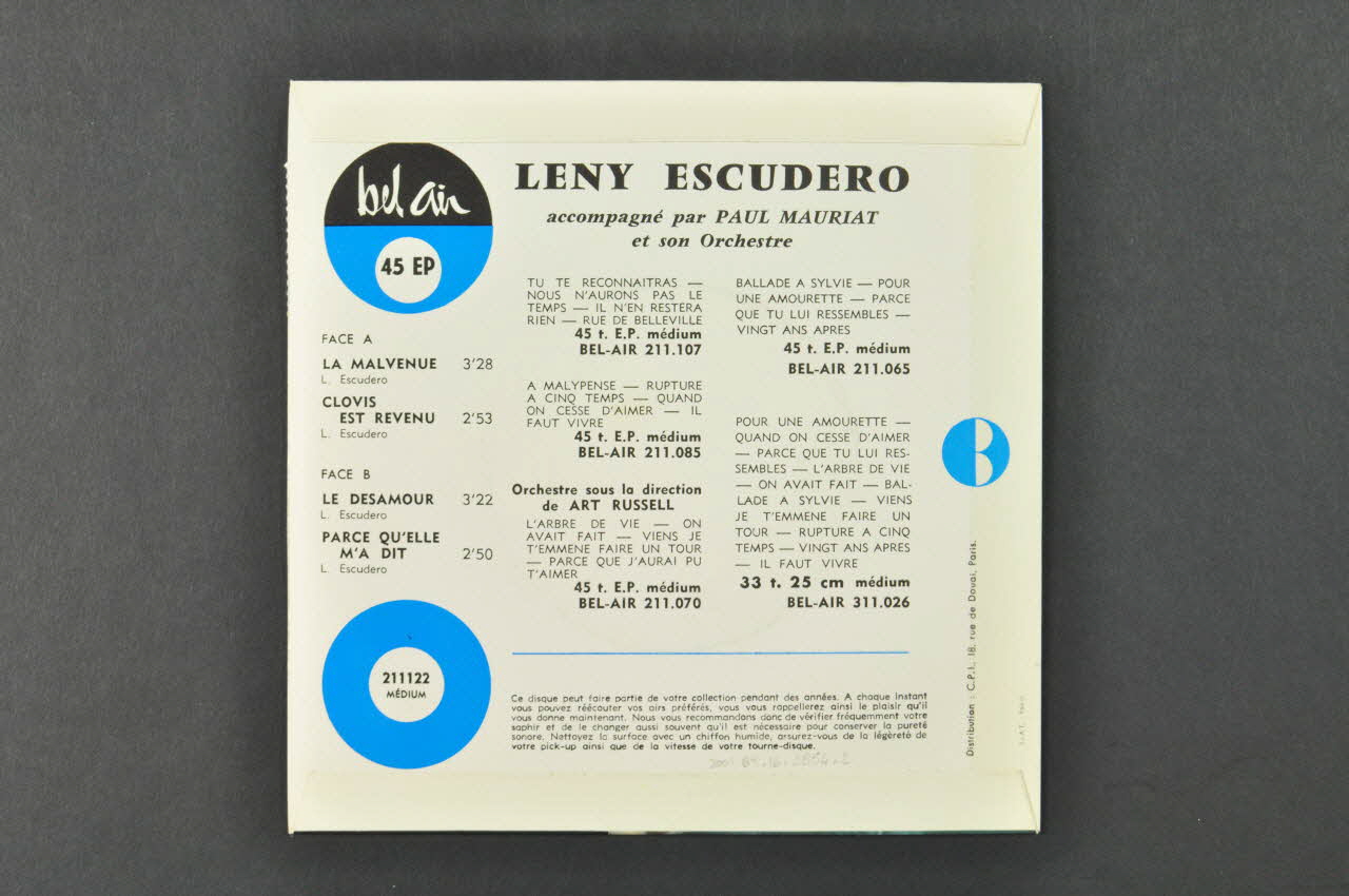 Le disque rond et noir comporte une perforation circulaire au centre. Une étiquette orange et blanche contenant le nom du chanteur, le titre des chansons, le logo de l'éditeur ainsi que d'autres inscriptions en noir est collée au centre.