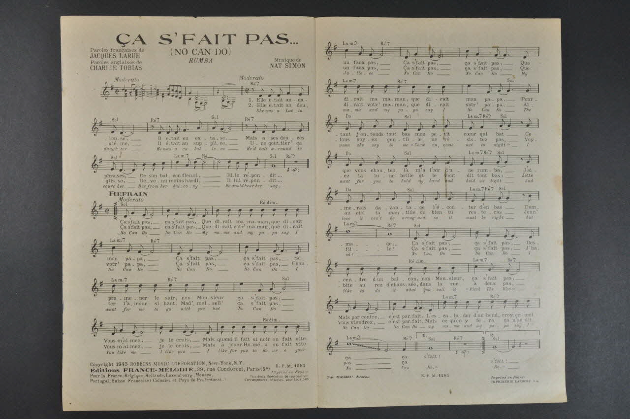 La première page présente la photographie de Jacques Hélian. Les inscriptions précisent le titre de la chanson, l'auteur et l'éditeur. A l'intérieur se trouvent la partition et les paroles de la chanson. Au dos, une liste de morceaux disponibles chez le même éditeur.Décor