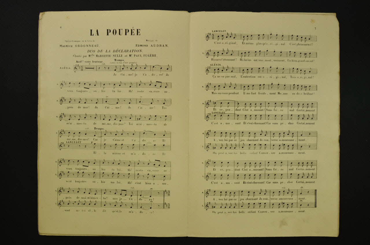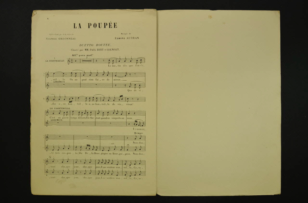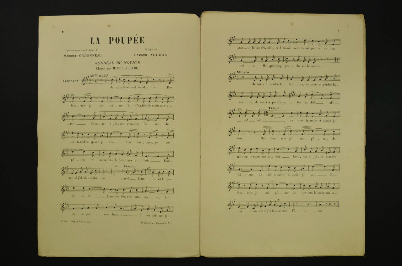 Trois feuillets rectangulaires en papier industriel, imprimé à l?encre noire. La couverture du premier feuillet présente le dessin d'une femme en robe longue dans un médaillon orné. Les autres couvertures présentent la première partie dela partition.