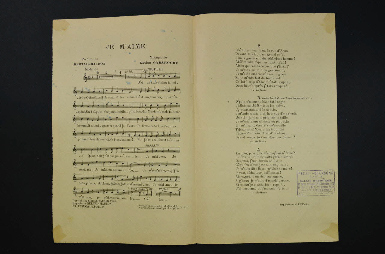 Des inscriptions renseignent le titre, les auteurs, les exécutants et l'éditeur. A l'intérieur, partition et paroles de la chanson. Au dos, liste d'autres partitions publiées par l'éditeur.Décor