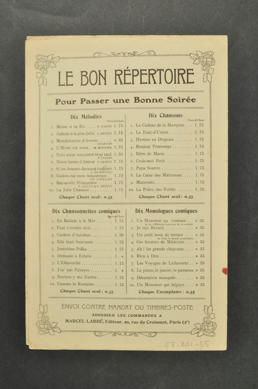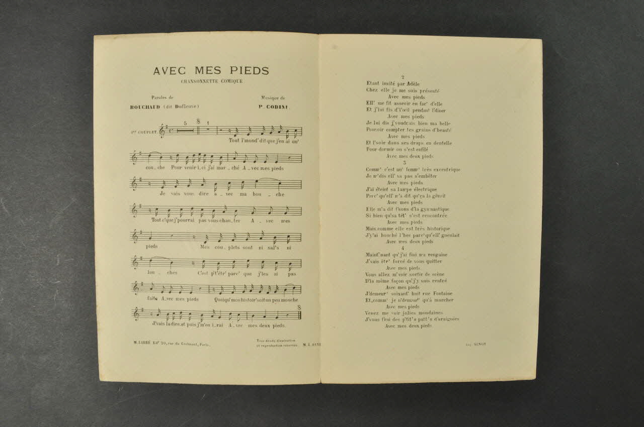 Des inscriptions renseignent le titre, les auteurs, les exécutants et l'éditeur. A l'intérieur, partition et paroles de la chanson. Au dos, liste d'autres partitions publiées par l'éditeur.Décor