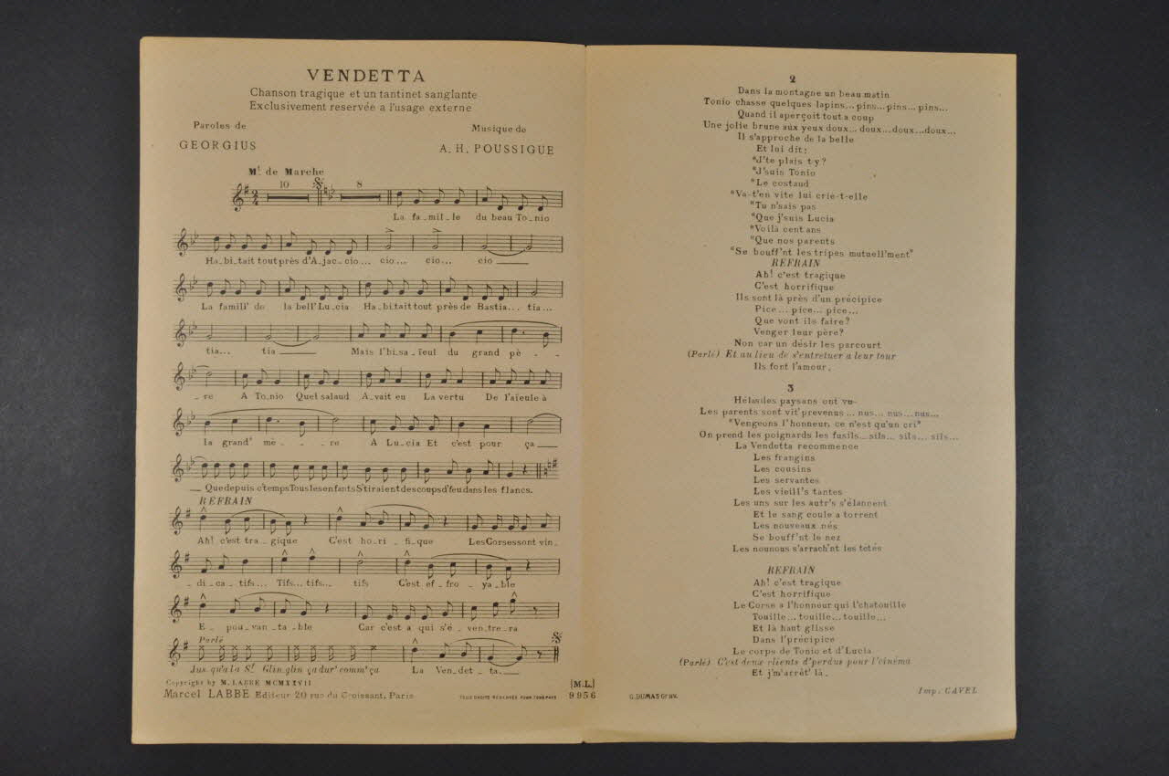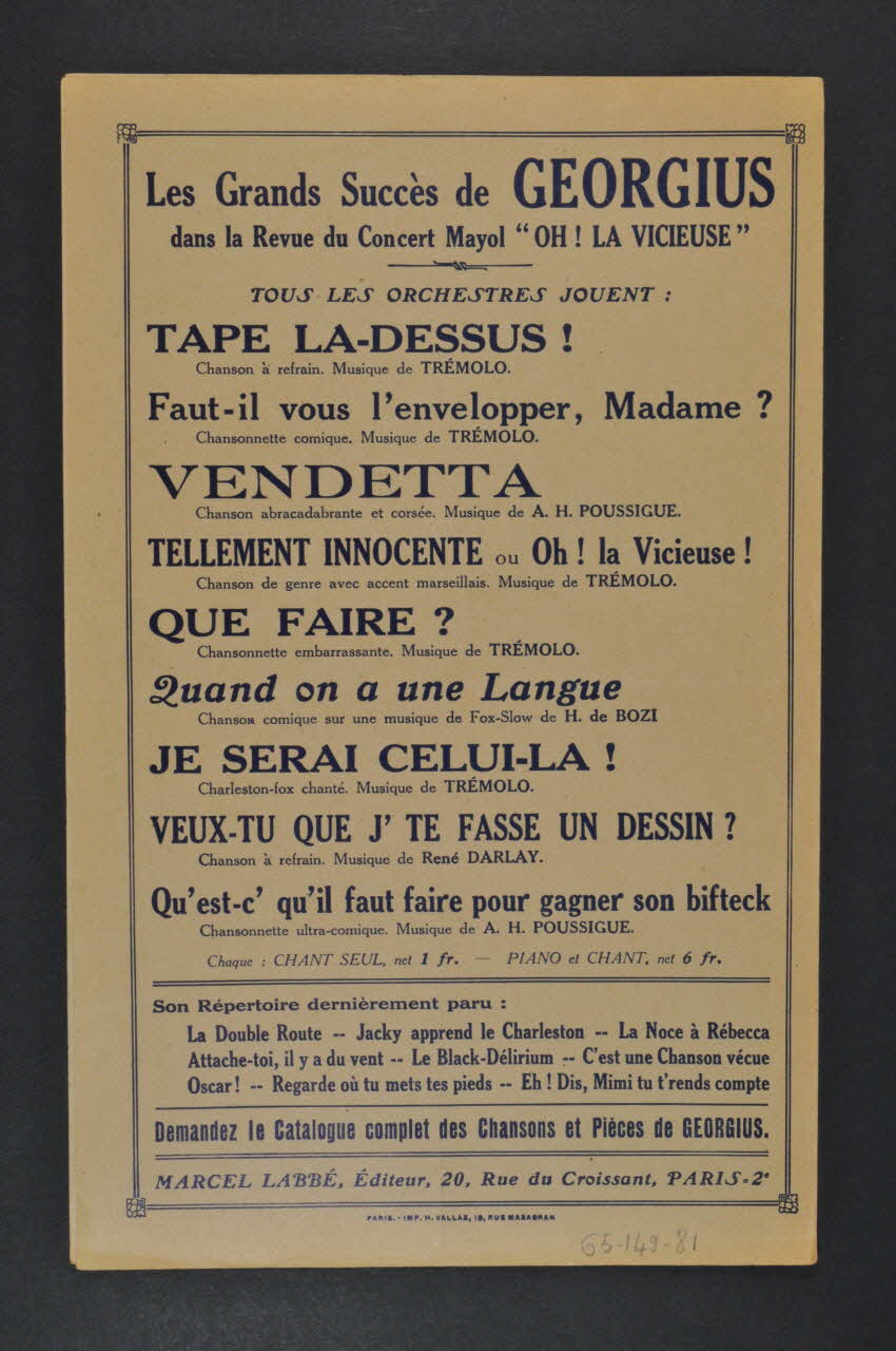 Des inscriptions renseignent le titre, les auteurs, les exécutants et l'éditeur. A l'intérieur, partition et paroles de la chanson. Au dos, liste d'autres partitions publiées par l'éditeur.Décor