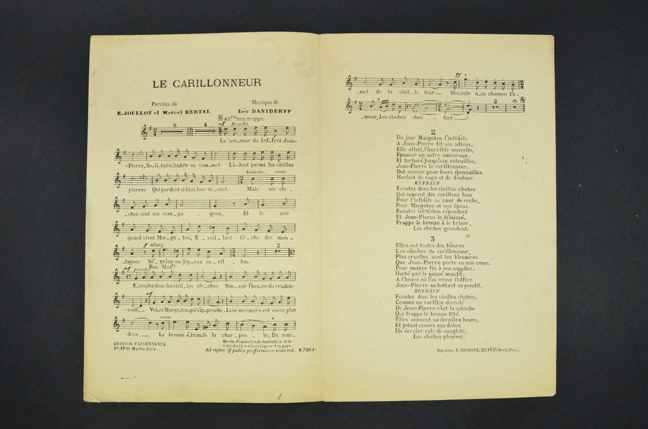 Des inscriptions renseignent le titre, les auteurs, les exécutants et l'éditeur. A l'intérieur, partition et paroles de la chanson. Au dos, liste d'autres partitions publiées par l'éditeur.Matériaux et techniques