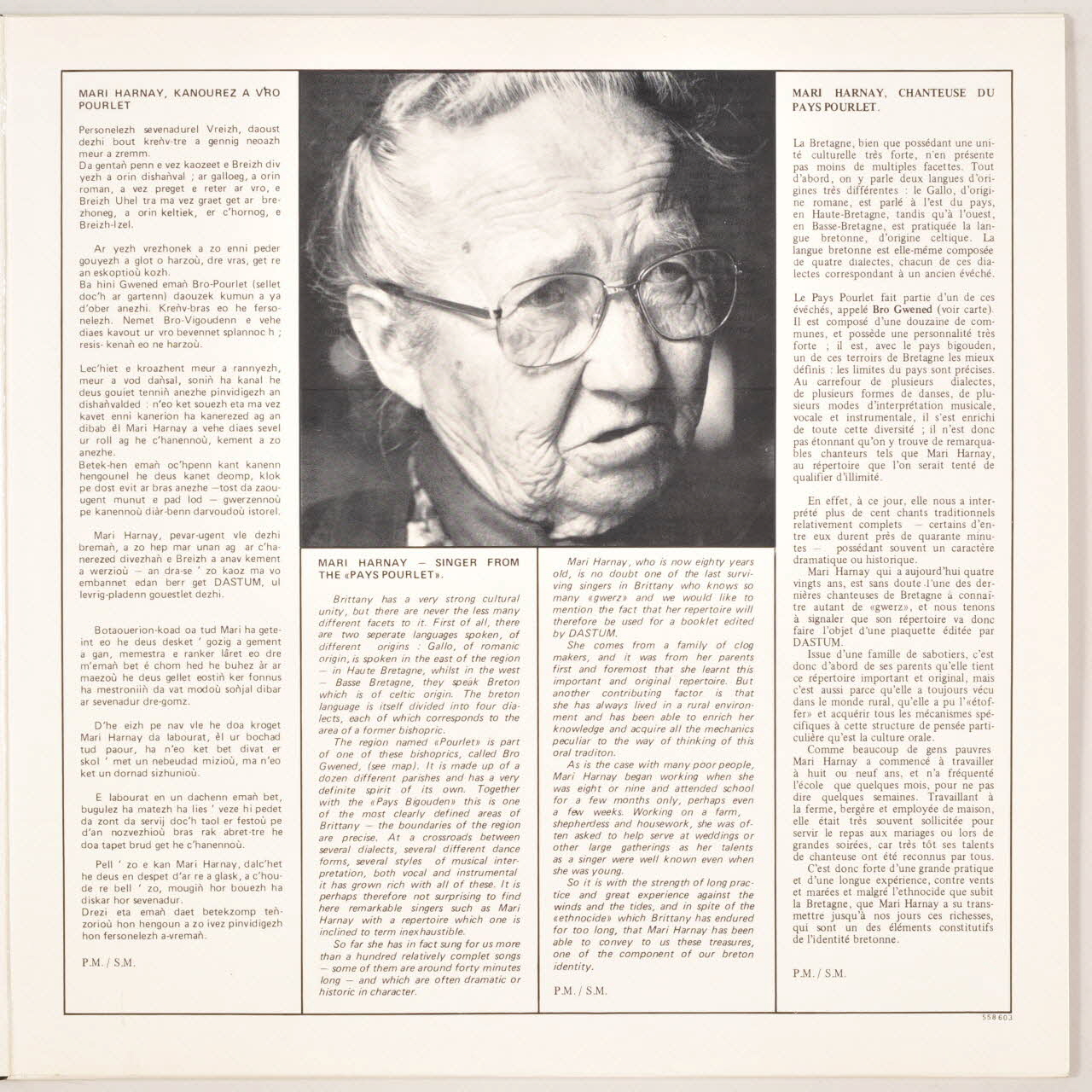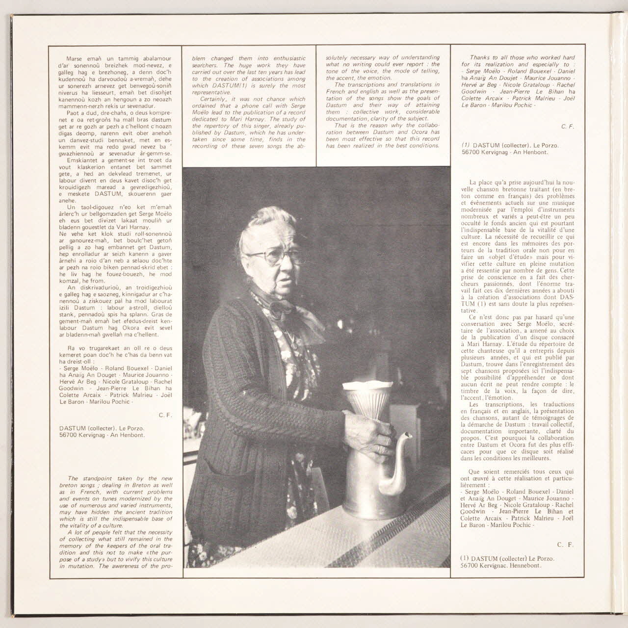 La pochette s'ouvre en livret, avec présentation des titres et informations sur l'album, en français et en anglais, qui se poursuivent au dos. Un livret accompagne le disque, avec les paroles des chansons et explications en breton, anglais et français. Au dos, une photographie de l'artiste. Au centre du disque, sur les deux faces, une étiquette circulaire en papier imprimé de couleur grise avec une écriture noire renseignant les titres, auteurs, exécutants et éditeur.Matériaux et techniques