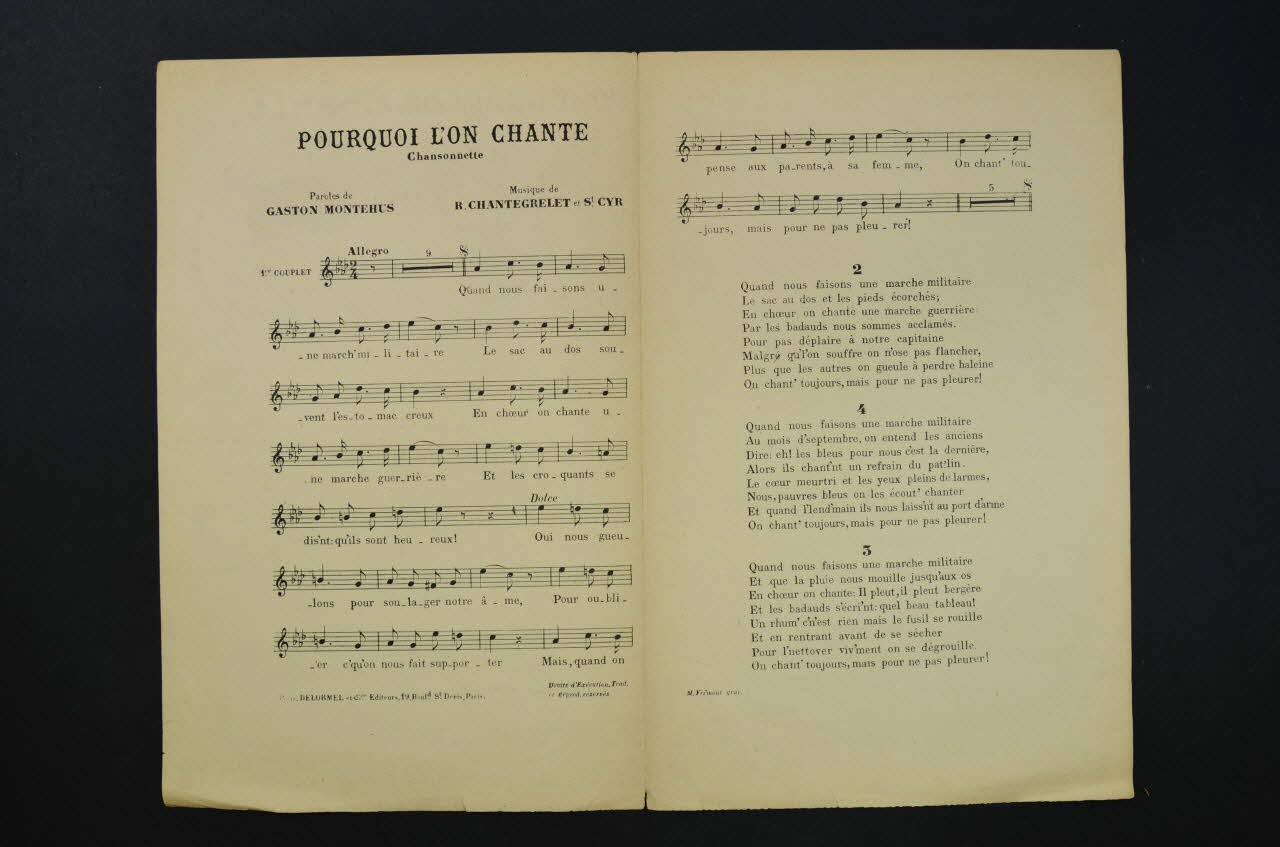 Les inscriptions renseignent le titre de la chanson, le nom des auteurs, de l'artiste et de l'éditeur. A l'intérieur, partition et paroles de la chanson. Au dos, liste d?autres partitions publiées par l?éditeur.Décor