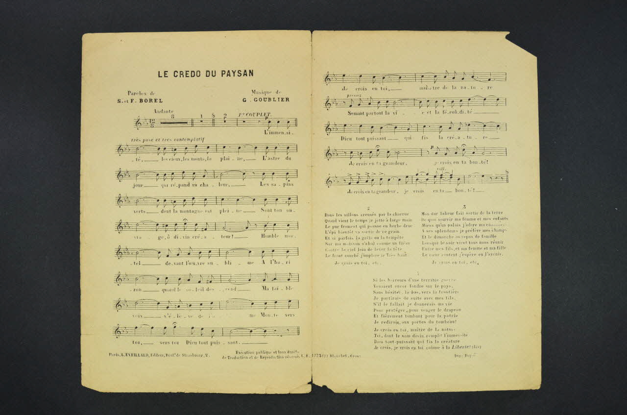 Des inscriptions renseignent le titre, les auteurs, les exécutants et l'éditeur. A l'intérieur, partition et paroles de la chanson. Au dos, liste d'autres partitions publiées par l'éditeur.Décor
