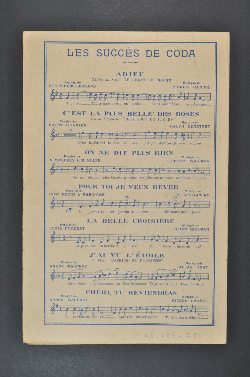 Feuillet rectangulaire en papier industriel imprimé à l'encre bleue (sauf à l'intérieur, encre noire). Sur la couverture, un portrait photographique de Lys Gauty.