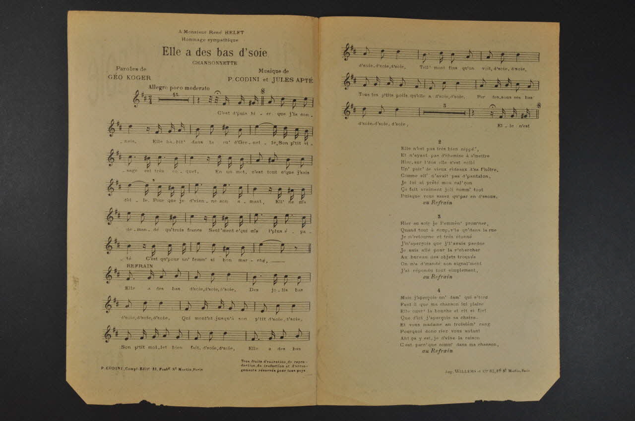 Des inscriptions renseignent le titre, les auteurs, les exécutants et l'éditeur. A l'intérieur, partition et paroles de la chanson. Au dos, liste d'autres partitions publiées par l'éditeur.Matériaux et techniques