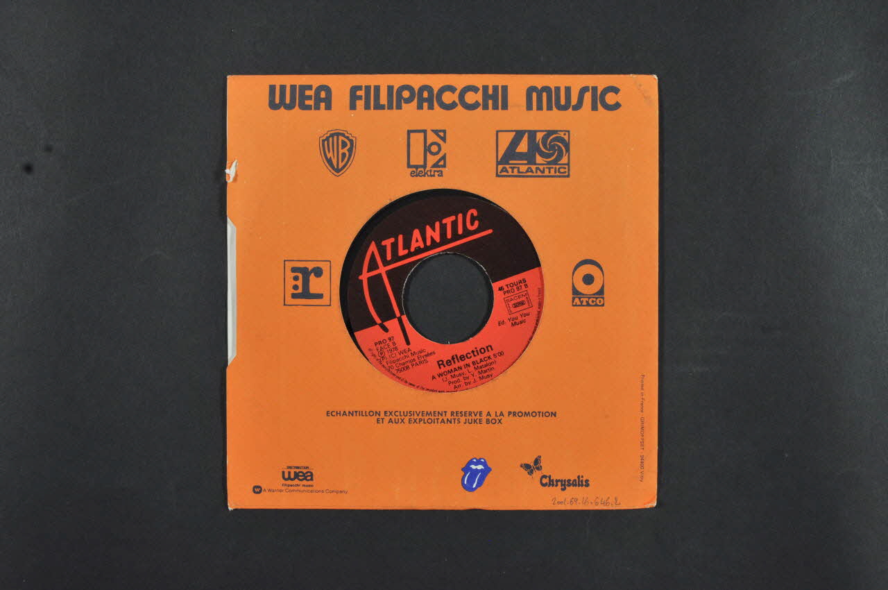 .1 Ce disque vinyle comporte une étiquette rouge et noire collée au centre de ses deux faces. Des inscriptions telles que ; logo de la société de production, nom de l'artiste, titres, durée et auteurs des morceaux y figurent.