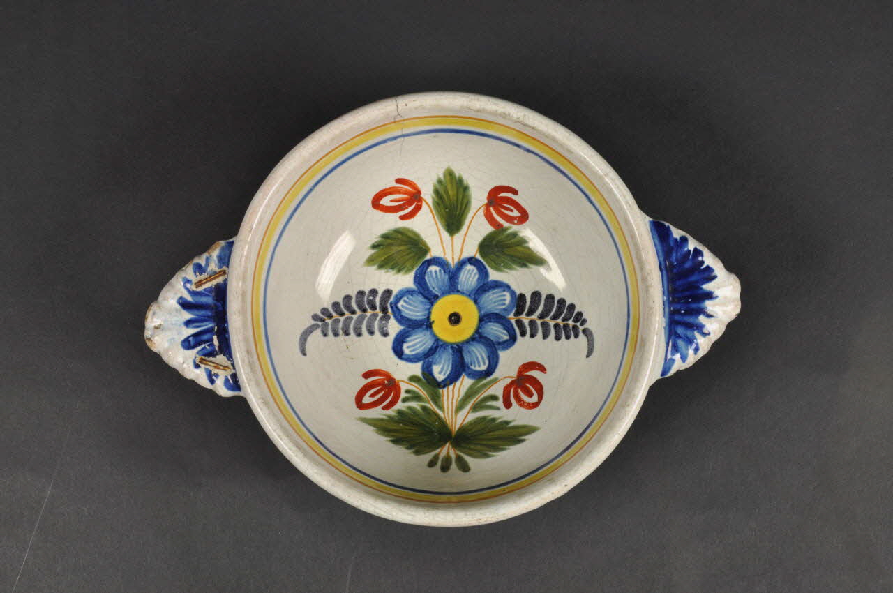 Faïence au tour, émaillée. Décor au pinceau / Sur plan circulaire avec pied-couronne, panse semi-hémisphérique et oreille moulurées. Glaçure blanche avec filets orange, jaune et bleu sur le pourtour et décor floral (bleu et jaune) dans le fond.Décor