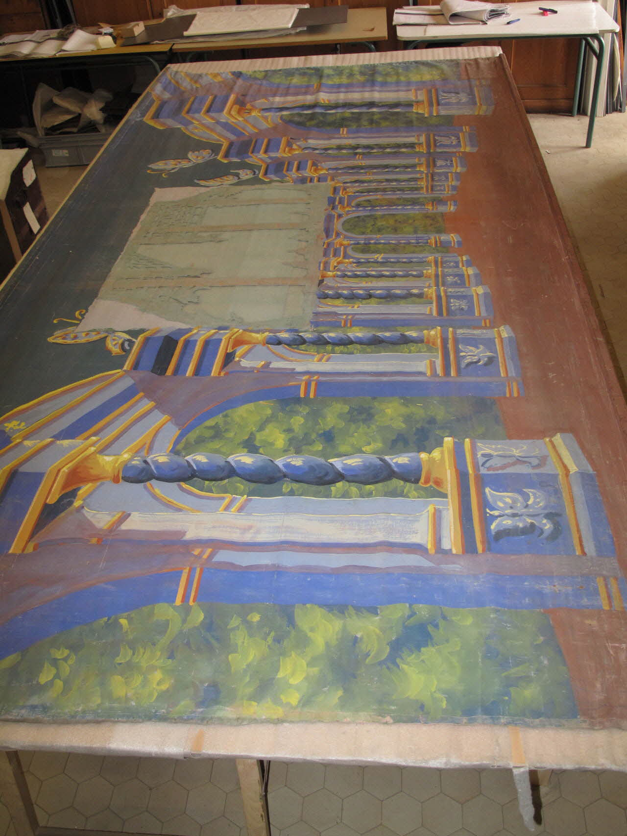 toile peinte à la colle, fixée aux extrémités entre deux baguettes de suspension en bois clouées entre elles / peinture à la colle / Le décor est ajouré. Au recto : la salle d'un palais chinois dont l'ouverture en arc outrepassé mèneà une véranda. On note les colonnes rouges et les consoles archotecturales en doré. Ce décor a servi pour "les cinq sous de Lavarède". Au verso : représentation de la place des papillons du rêve pour "les cinq sous de Lavarède": colonnes torses peintes en bleu, chapiteaux dorés, arcades ouvrant sur une végétation luxuriante.Décor