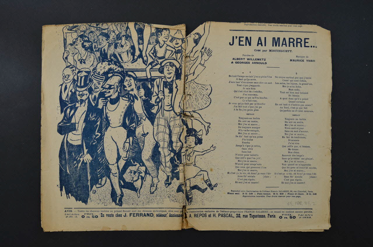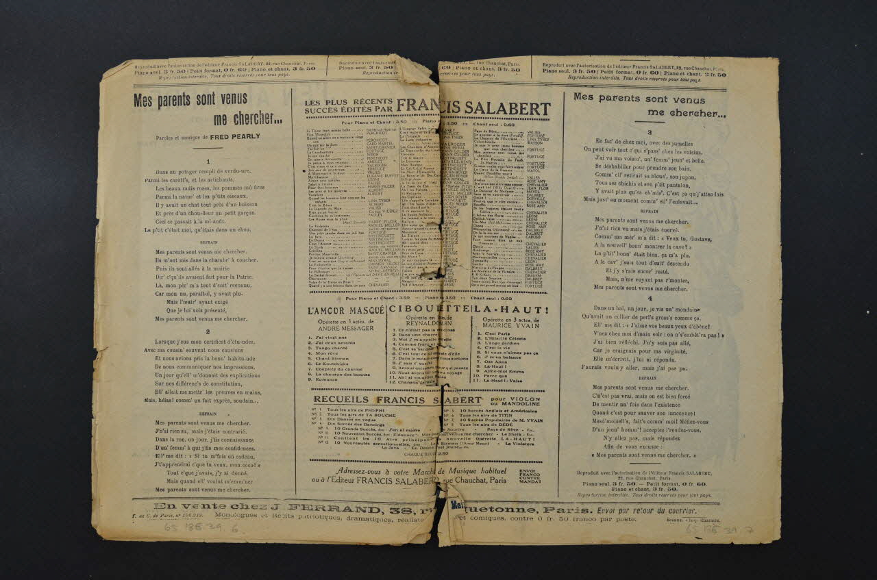 papier imprimé / Feuillet rectangulaire en papier industriel imprimé à l'encre. L'intérieur comporte les paroles et la partition de la chanson. Au dos, publicité pour l'éditeur