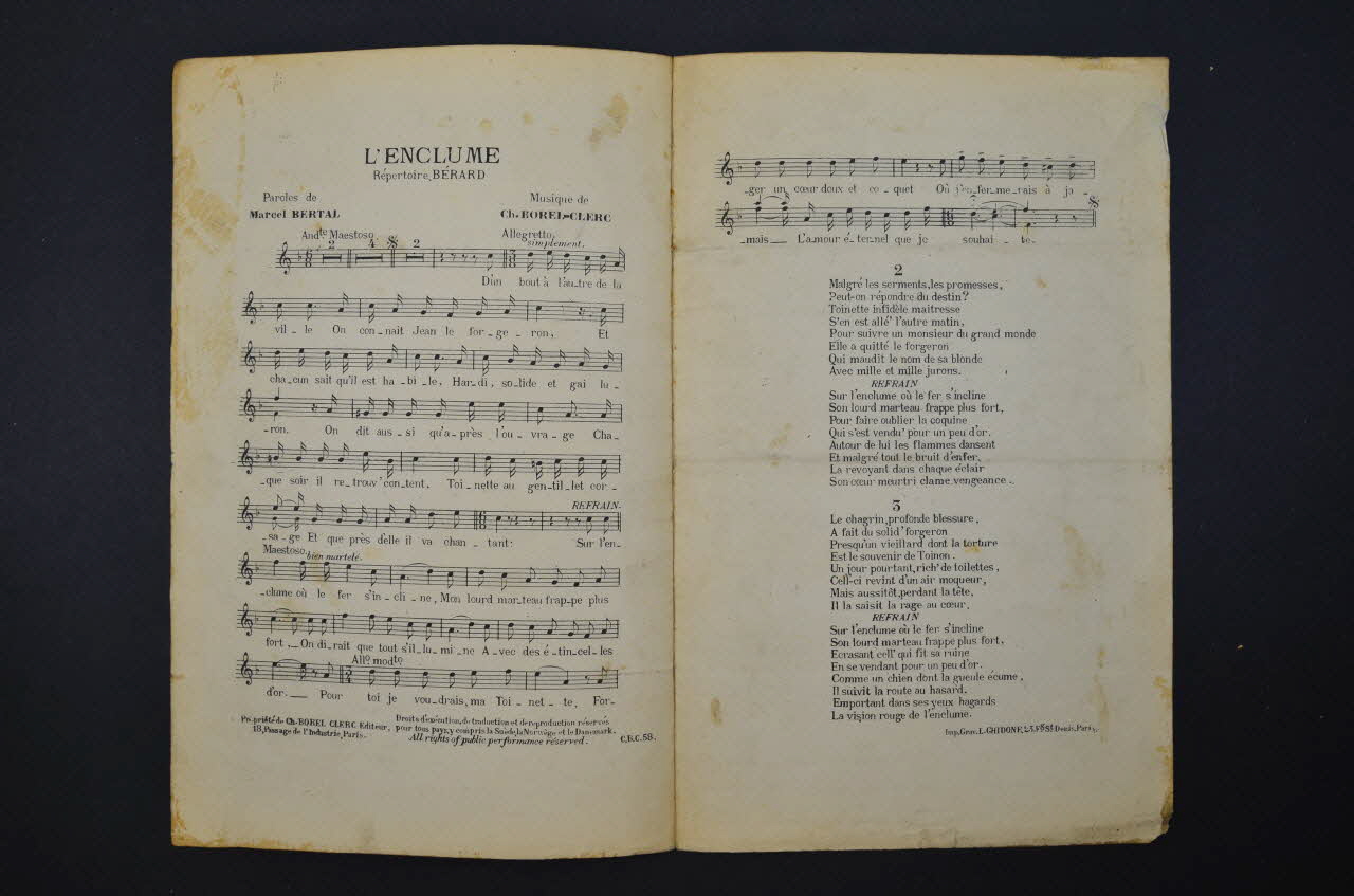 Les inscriptions renseignent le titre de la chanson, le nom des auteurs, de l'artiste et de l'éditeur. A l'intérieur, partition et paroles de la chanson. Au dos, liste d?autres partitions publiées par l?éditeur.Matériaux et techniques