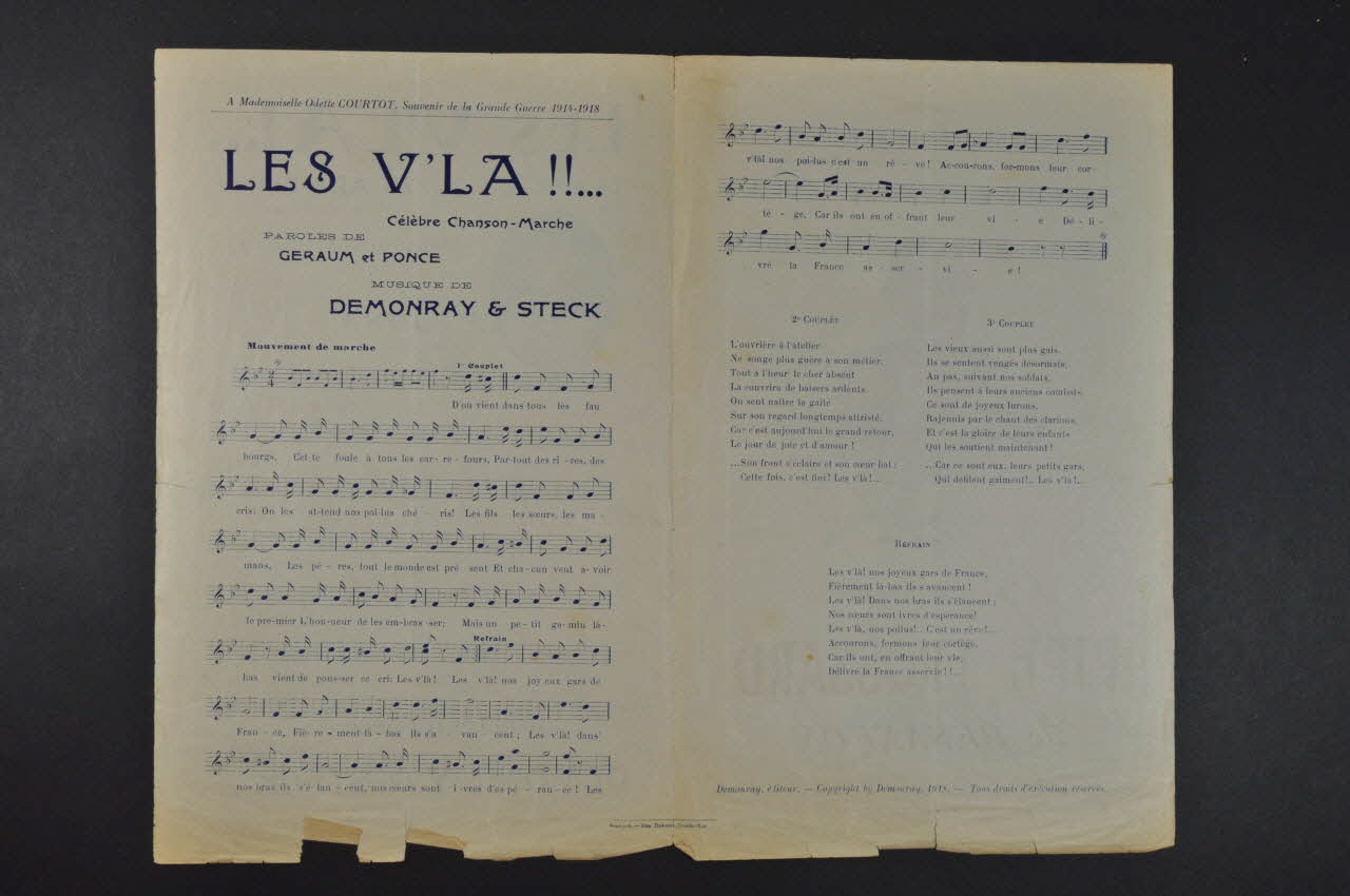 Des inscriptions renseignent le titre, les auteurs, les exécutants et l'éditeur. A l'intérieur, partition et paroles de la chanson. Au dos, une publicité pour les pipes Frossard.Décor