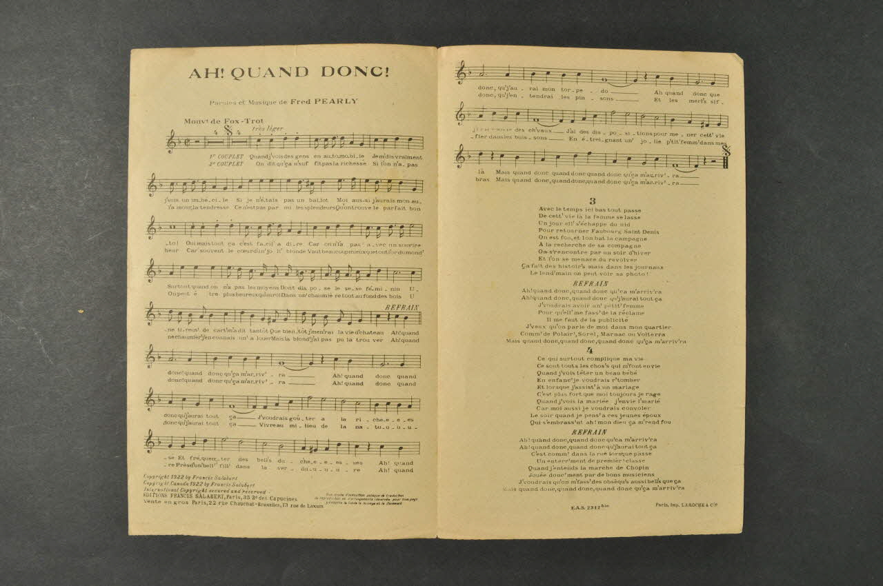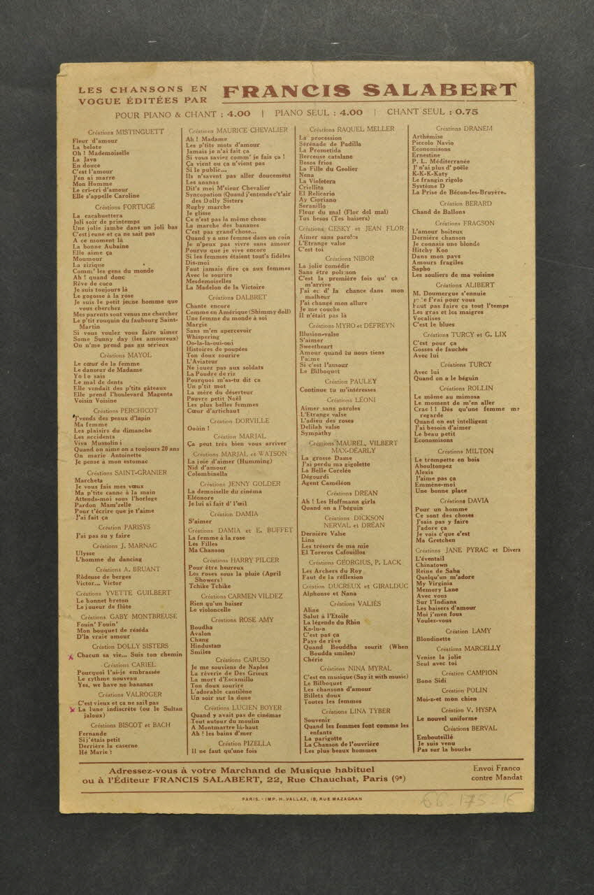 Les inscriptions renseignent le titre de la chanson, le nom des auteurs, de l'artiste et de l'éditeur. A l'intérieur se trouvent la partition et les paroles de la chanson. Au dos, liste d?autres partitions publiées par l?éditeur.Décor